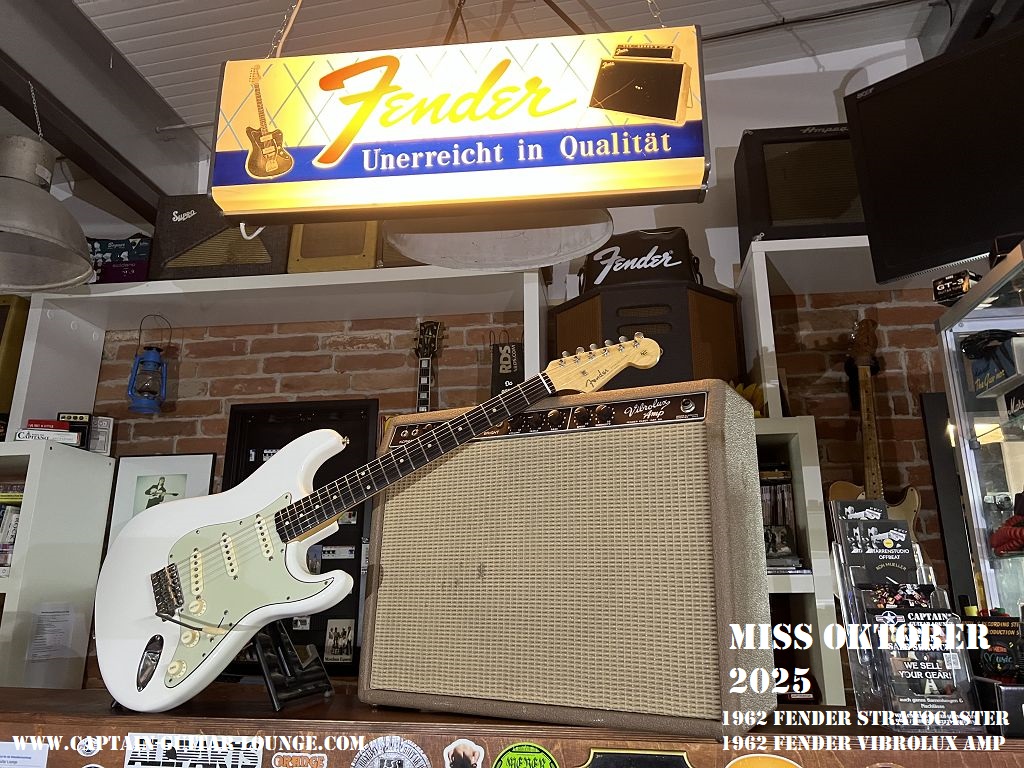 Miss Oktober steht ganz im Zeichen der Firma Fender. "Unerreicht in Qualität" steht auf der Leuchtreklame, die aus der gleichen Zeit stammt wie die 62er Strat und der 62er Vibrolux Amp. Die Strat...