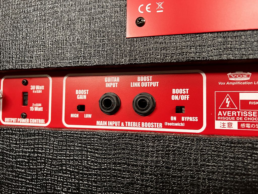 An der Rückwand befinden sich Schalter und Regler um den Treble Booster zu aktivieren, den Amp von 30W auf 15W zu reduzieren und ein nachträglich eingebauter Regler zum Drosseln der Ausgangsleistung (Power Scaling). Sehr vernünftig bei der enormen Lautstärke, die der Amp entwickelt.