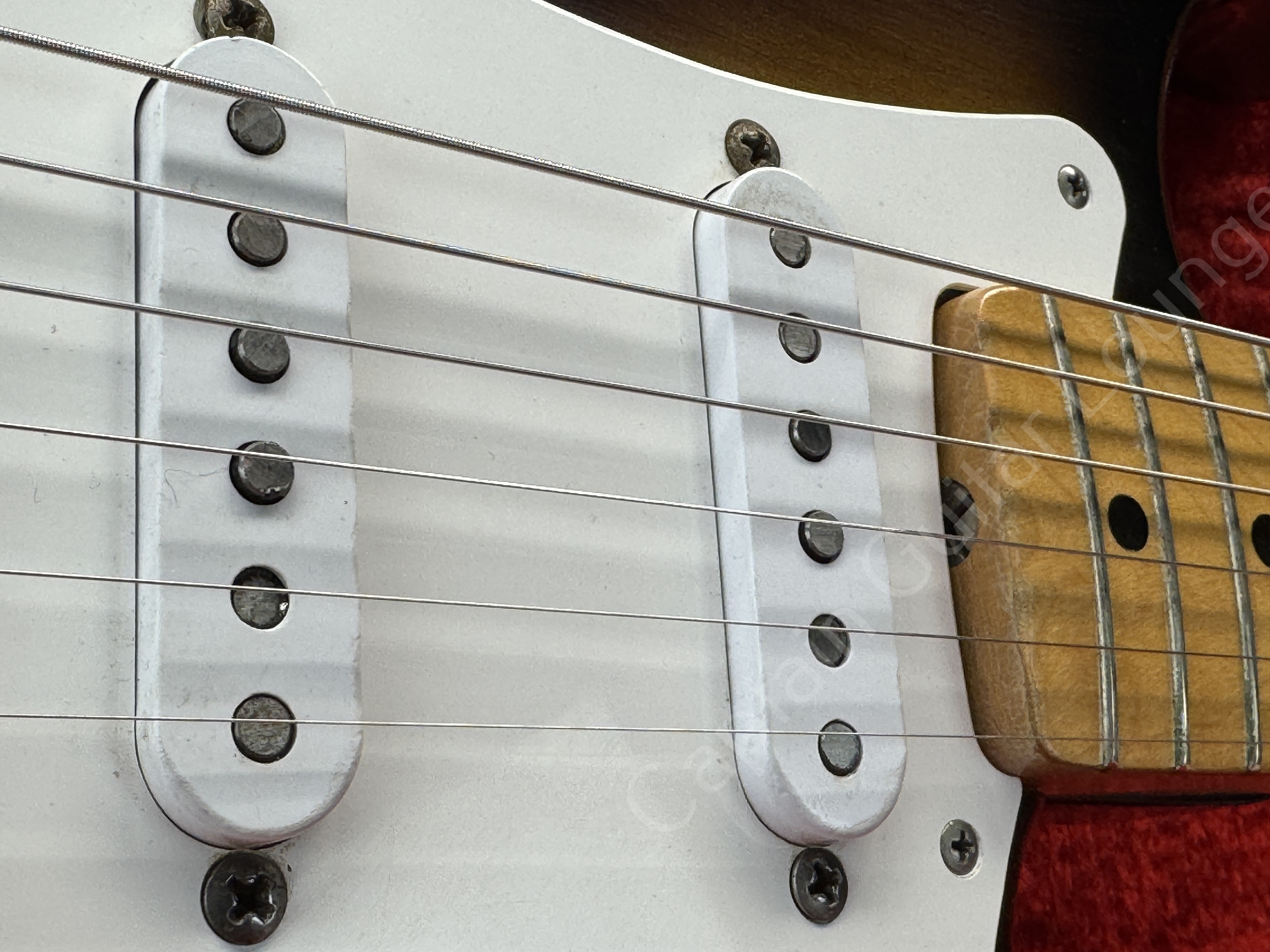 1-piece ash body in 2-tone sunburst, powerful "C" with light V-profile, maple neck with 7.25" radius, 1-ply 8-hole pickguard and black bottom single coils.