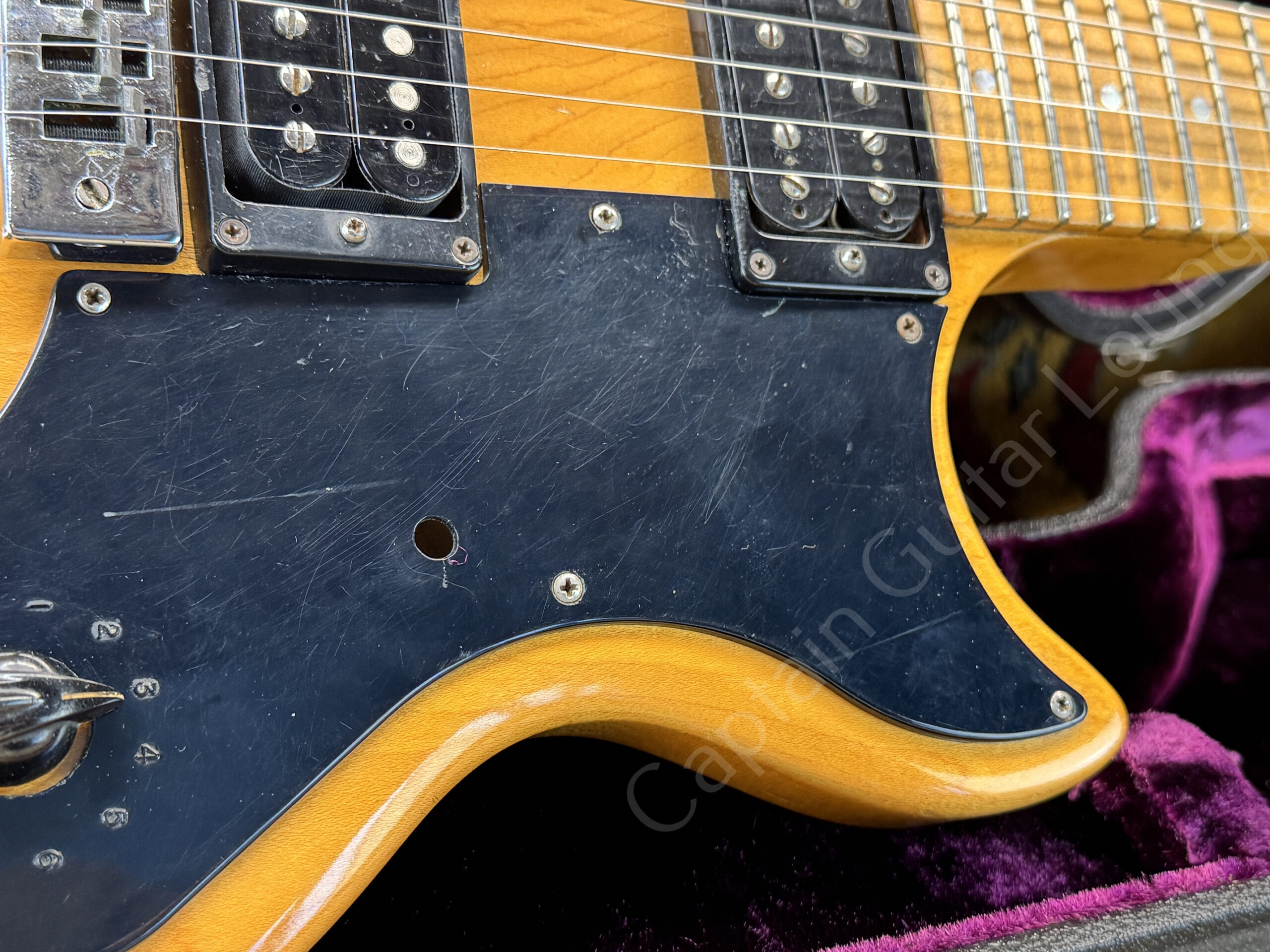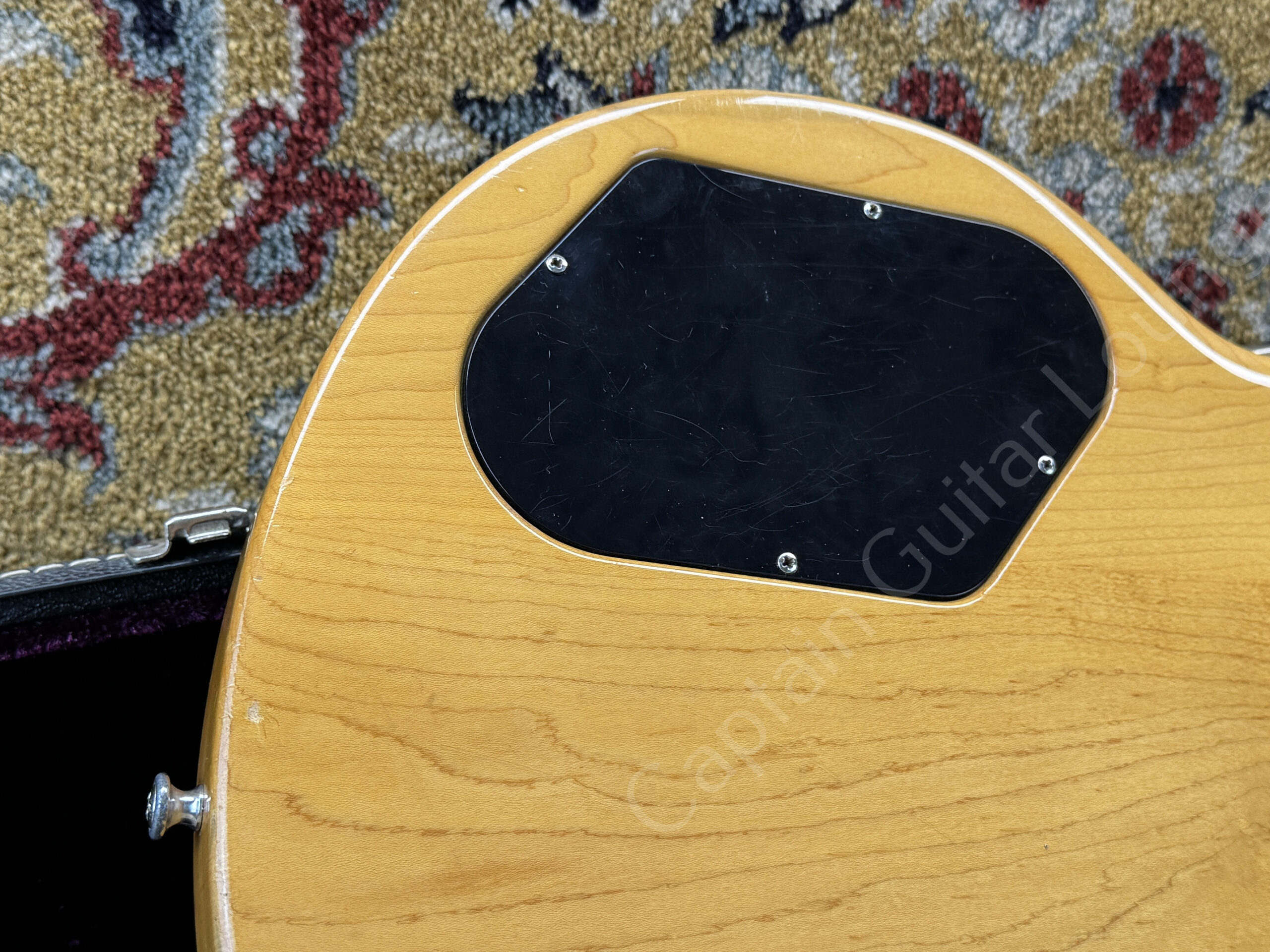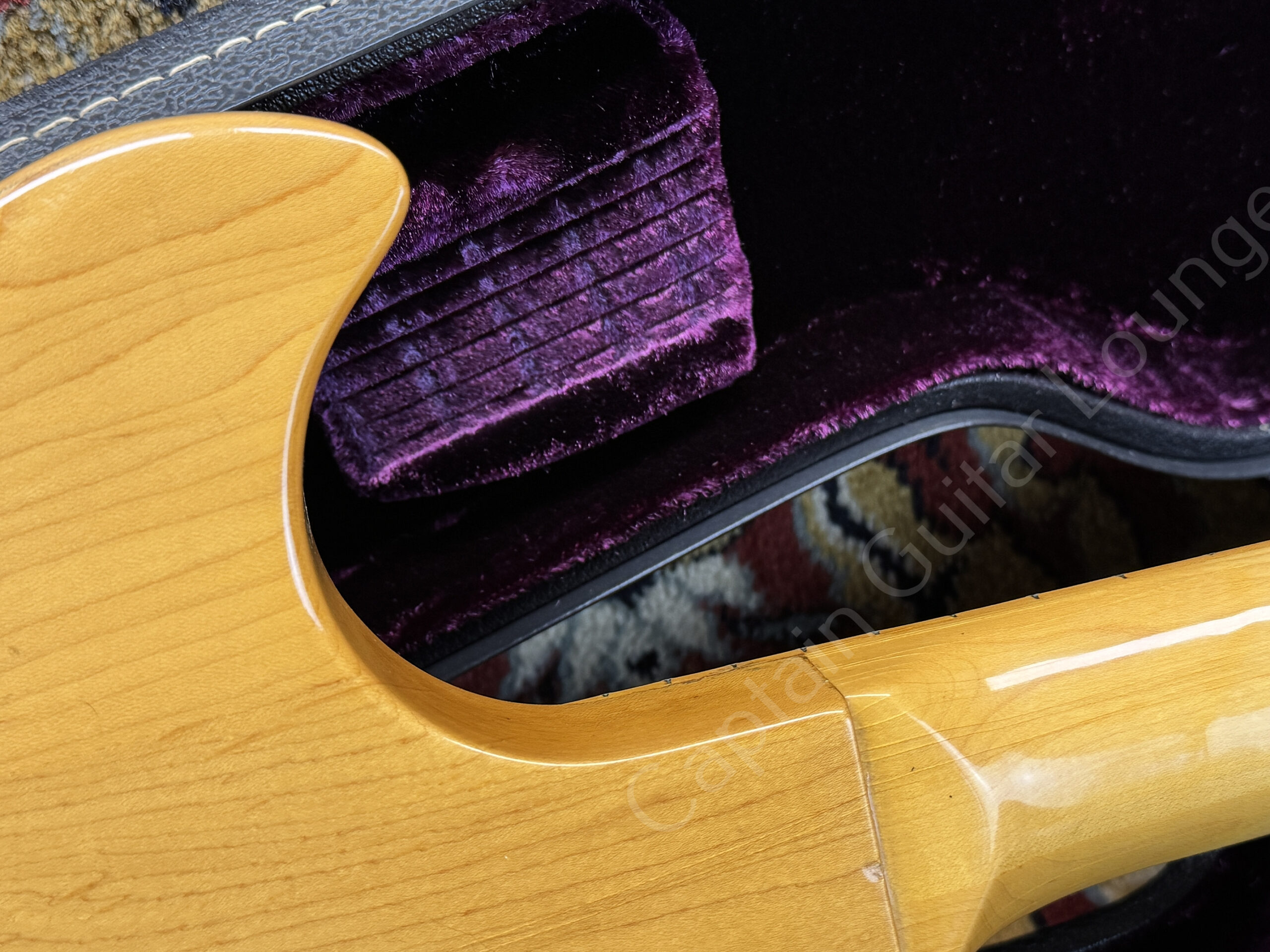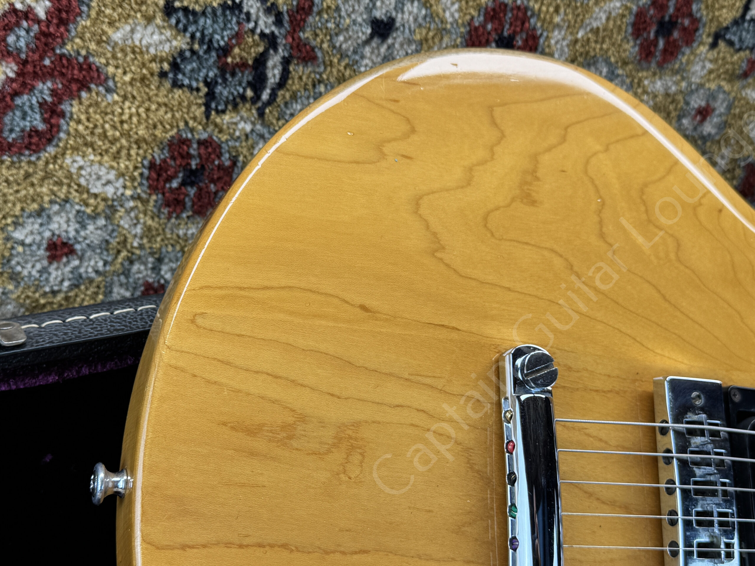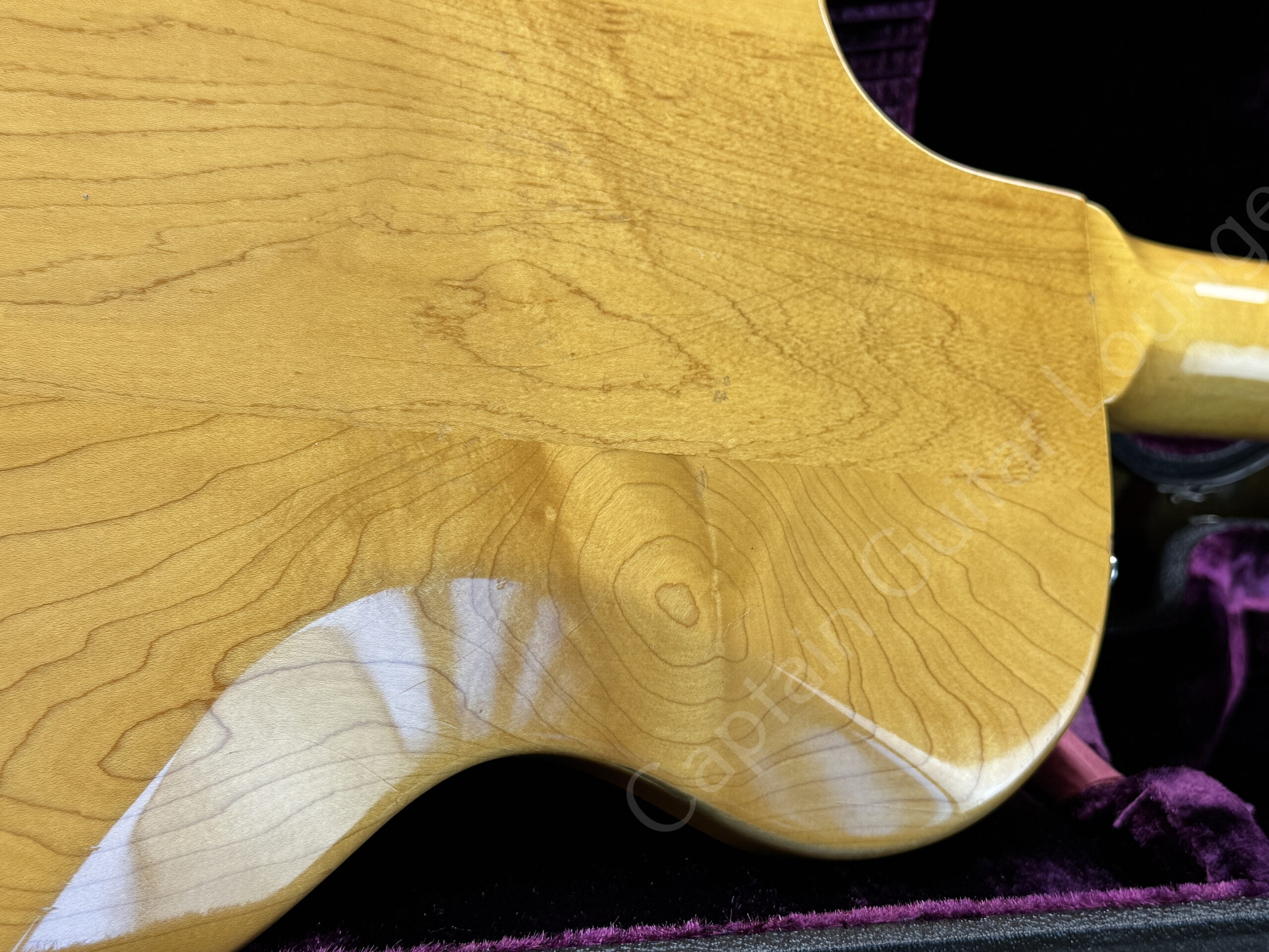 The natural maple finish shows charm and patina, including a hole in the pickguard and small milling in the body - typical vintage character.