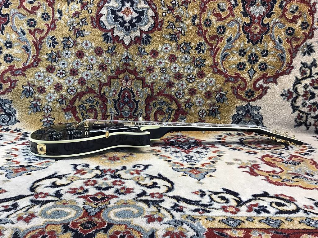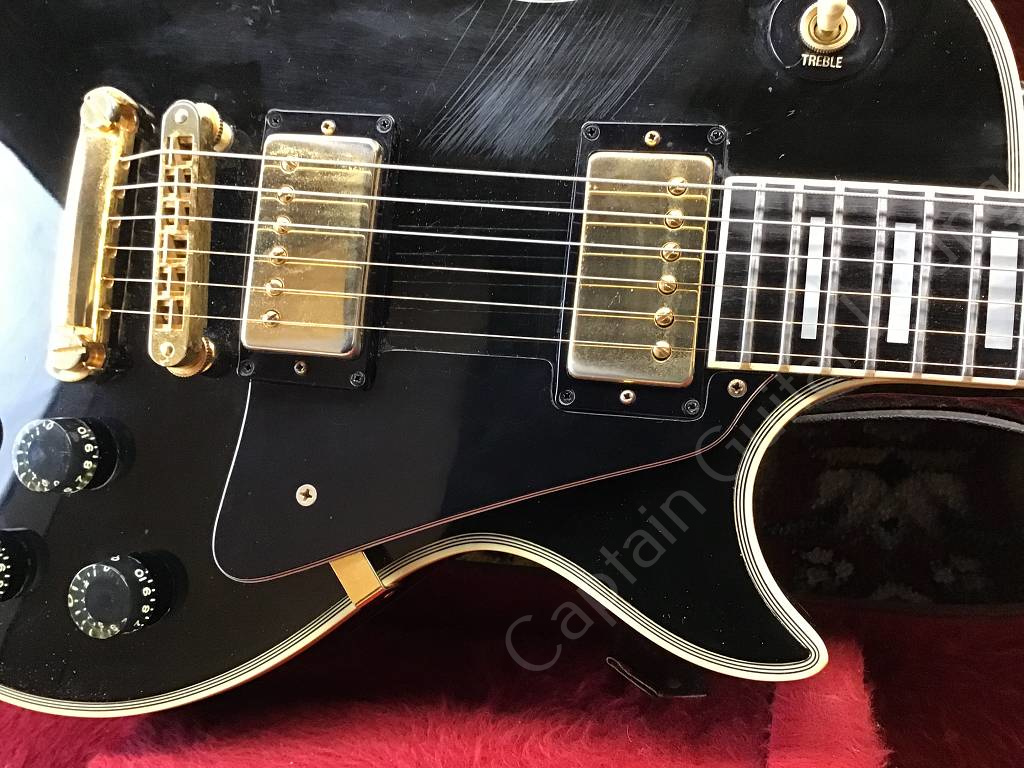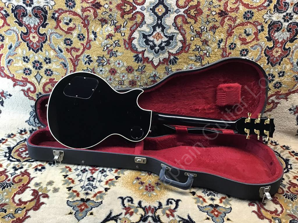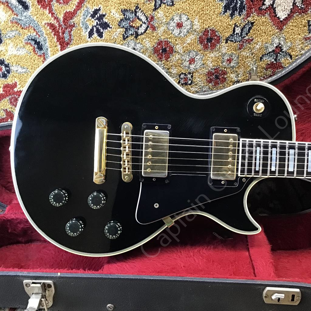 Well preserved Gibson Les Paul Custom Ebony from 1980 with the typical features of the Black Beauty of that year, such as three-piece maple neck with volute, heavy mahogany body, gold-plated hardware, Nashville Tune-o-matic bridge with pins, Tim Shaw humbucker.