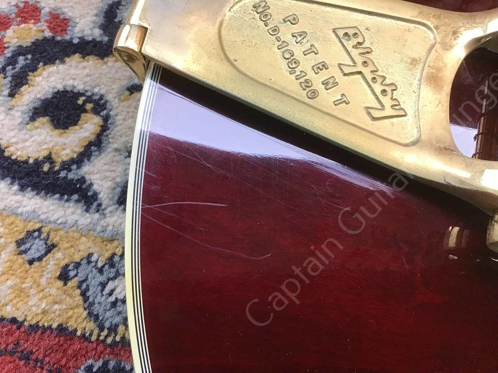 The original pickguard has crumbled (no longer present) and has attacked the gold plating of the pickup caps and the bigsby during the outgassing process. We were able to remove most of the verdigris.