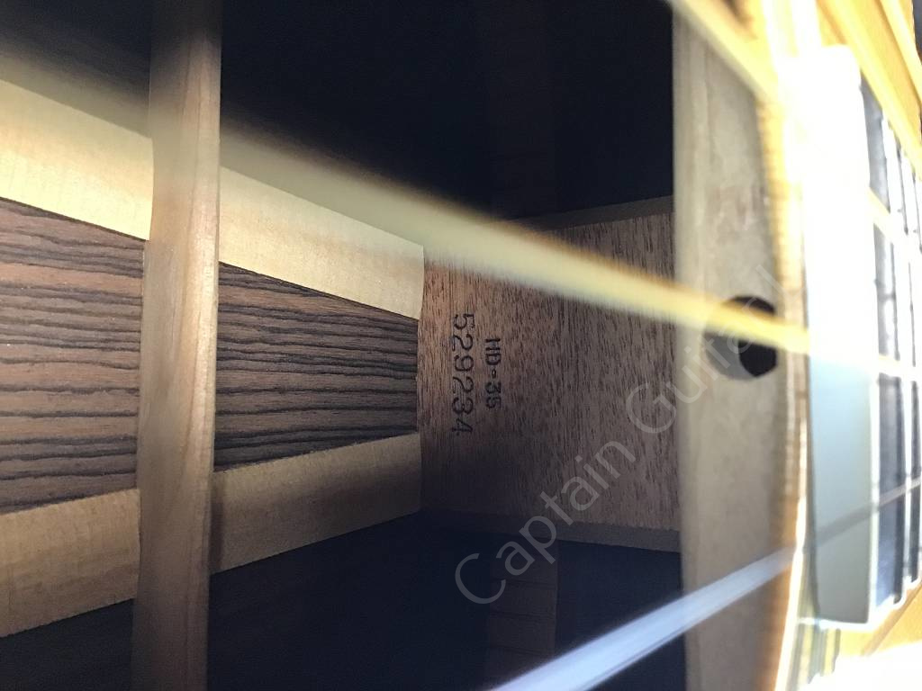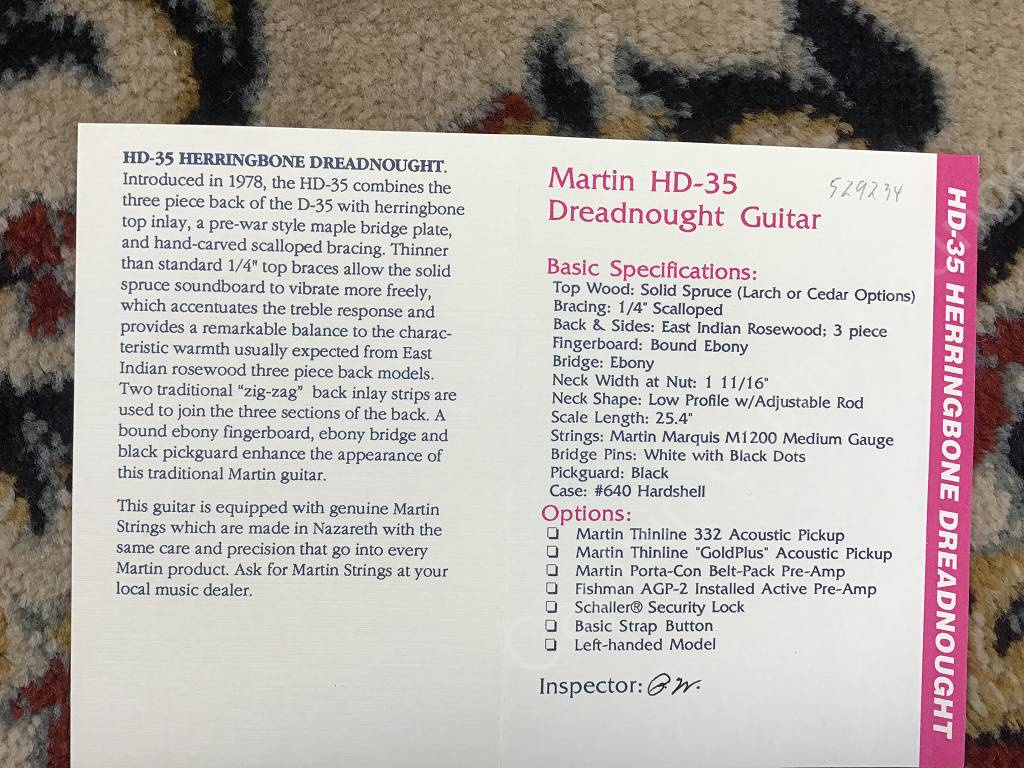 In 1978, the traditional guitar maker C.F. Martin & Co introduced the HD-35 model. It combines the three-piece back of the D-35 with a herringbone top binding, a pre-war style maple bridge plate and hand-carved scalloped bracing. The ebony fingerboard has a white binding. The 35 series is particularly popular with bluegrass and acoustic musicians.