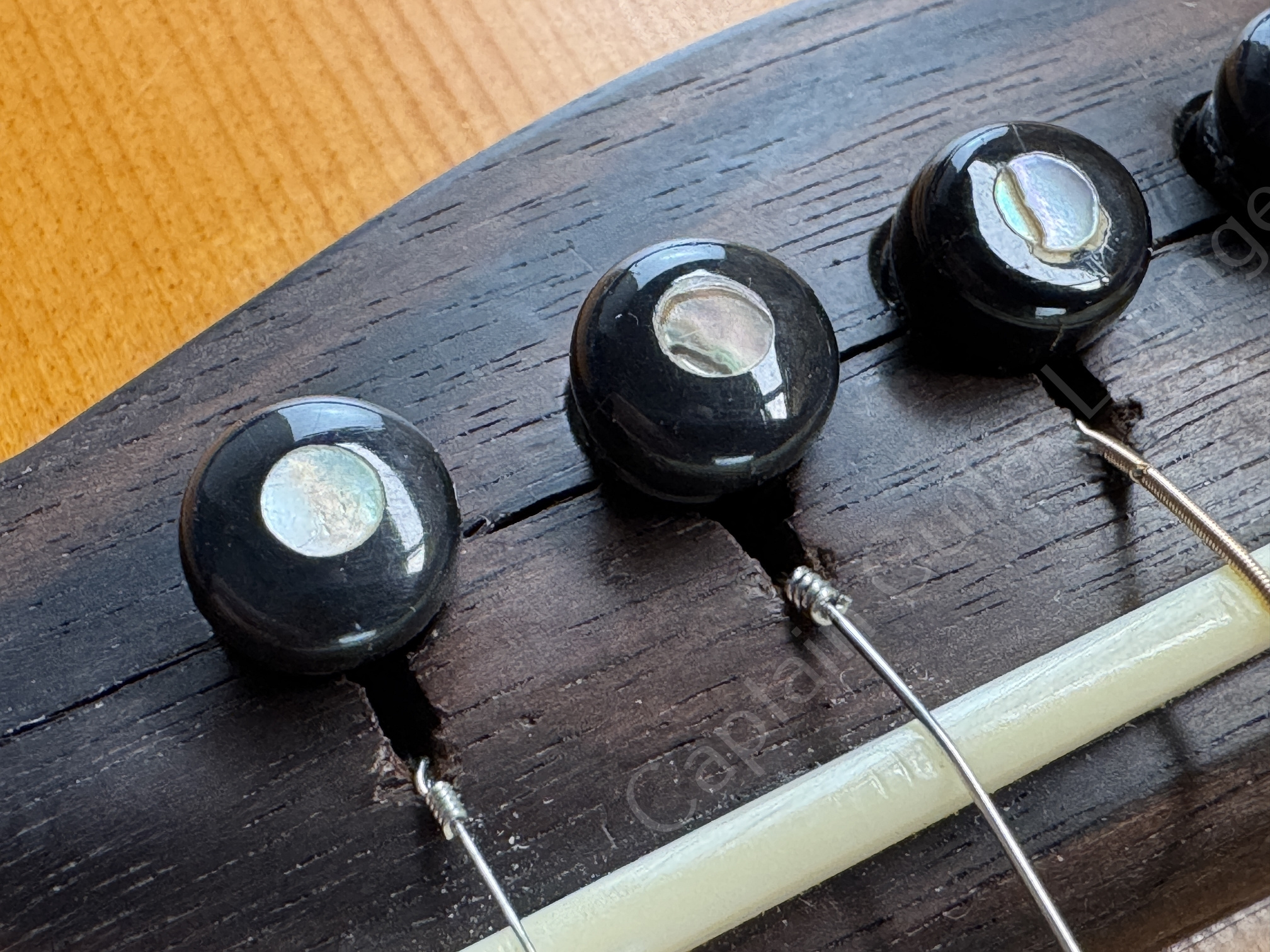 The guitar is in good condition with only a few signs of use. A small dent (approx. 4 mm) and a fine crack in the bridge, see photos, but does not affect the sound or playability. A passive piezo pickup is installed and works perfectly.