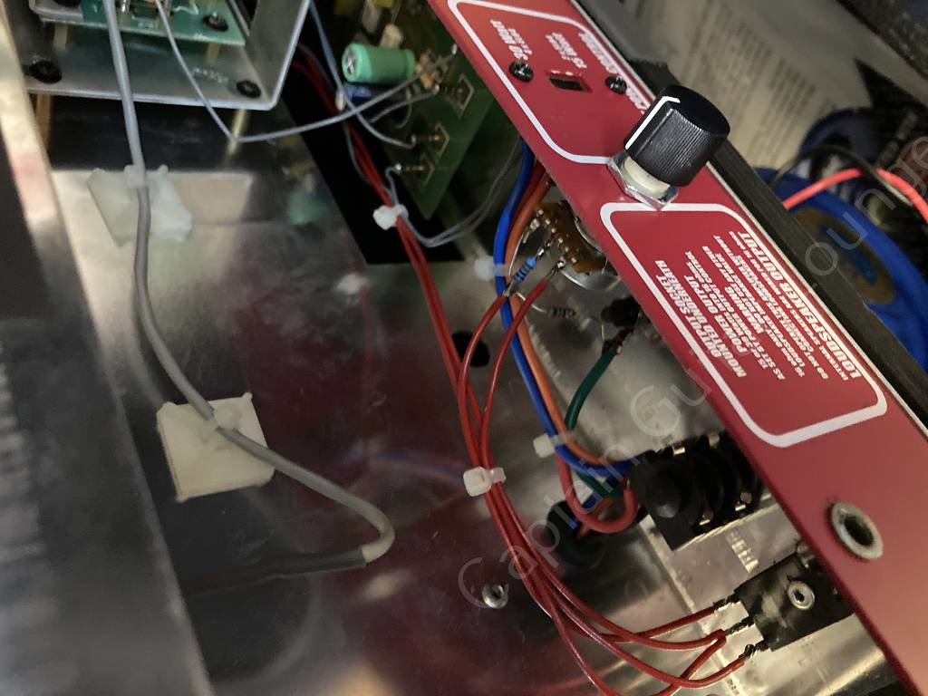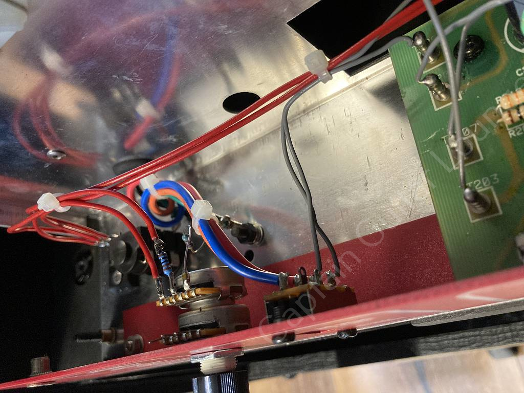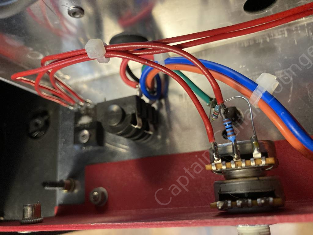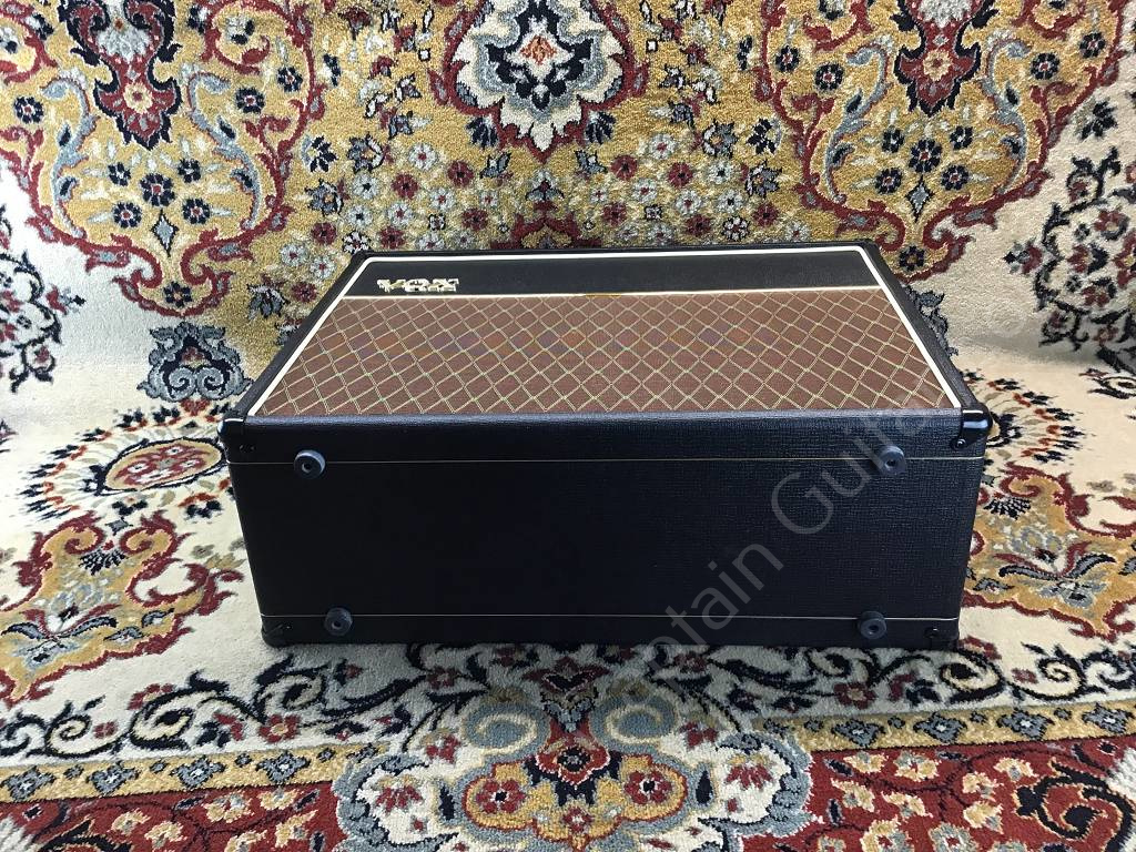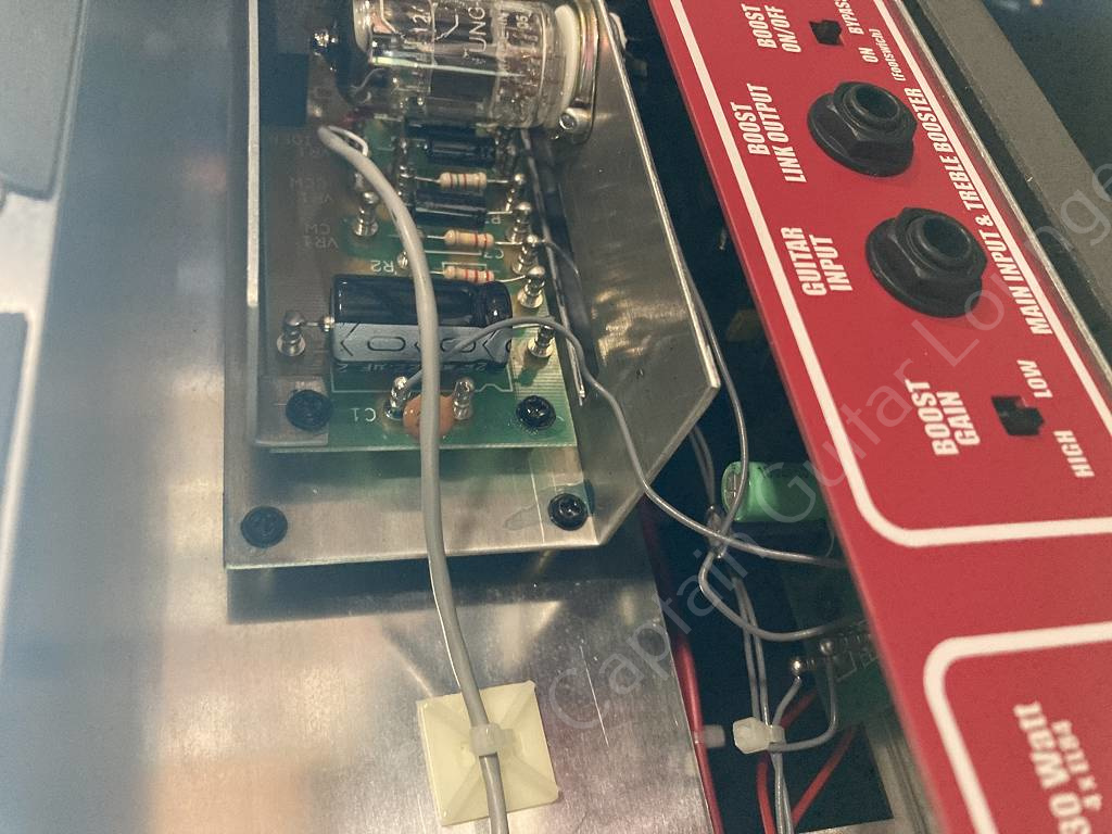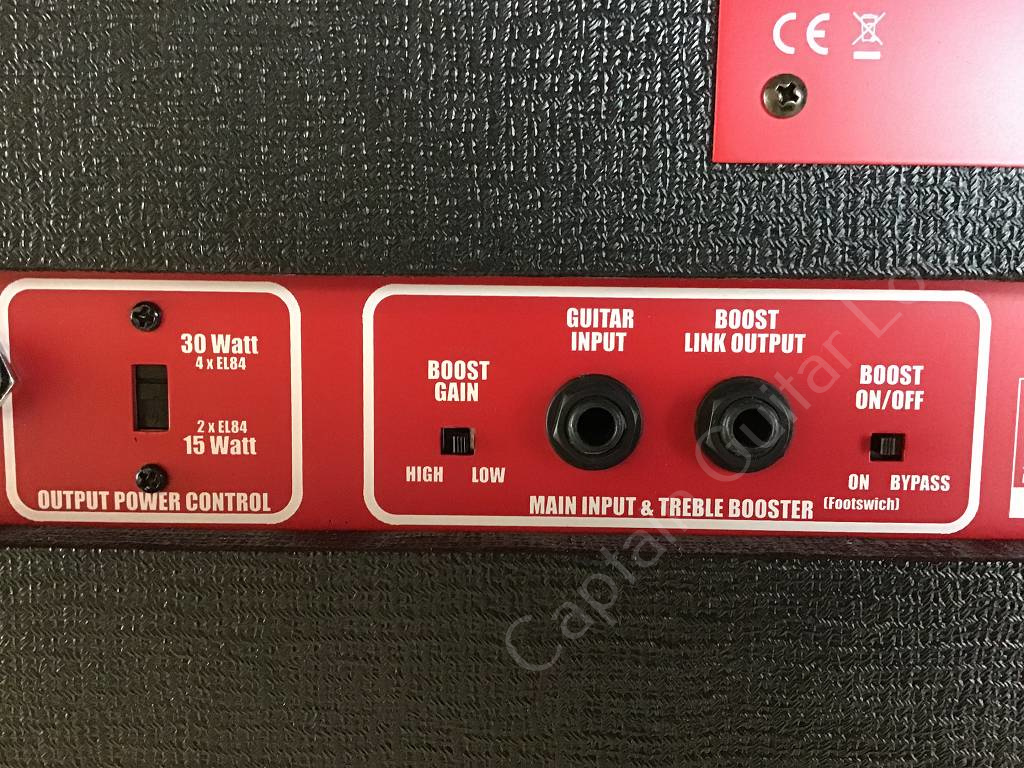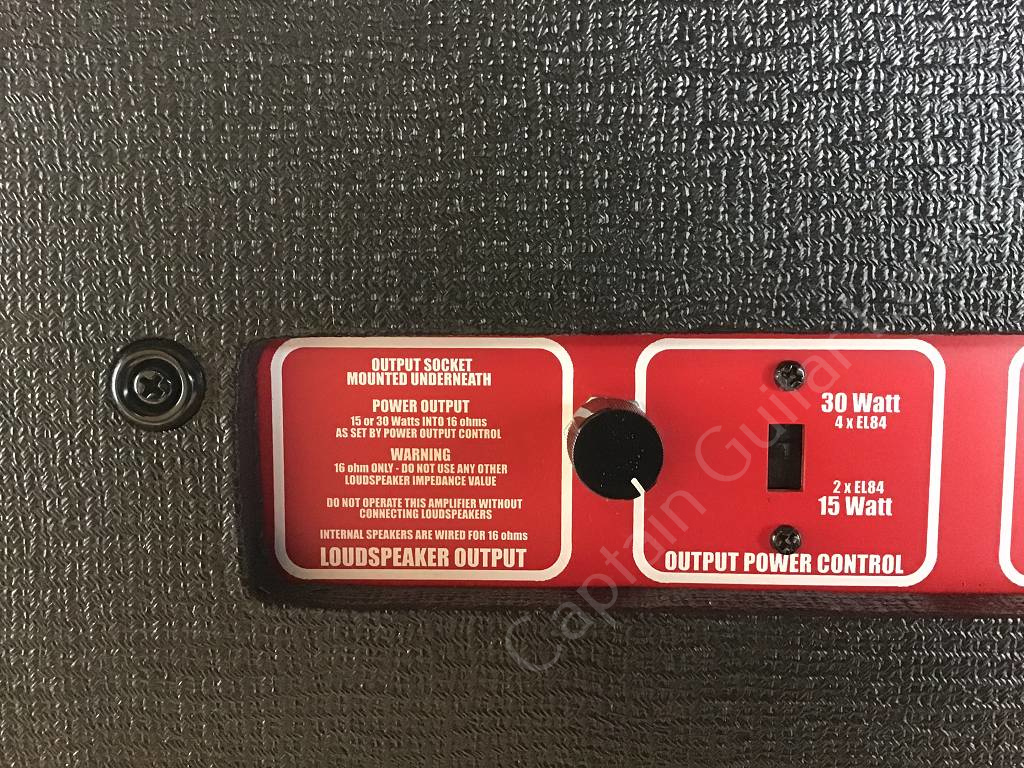 On the rear panel there are switches and controls to activate the treble booster, to minimize the amp from 30W to 15W and a retrofitted control to throttle the output power (power scaling).