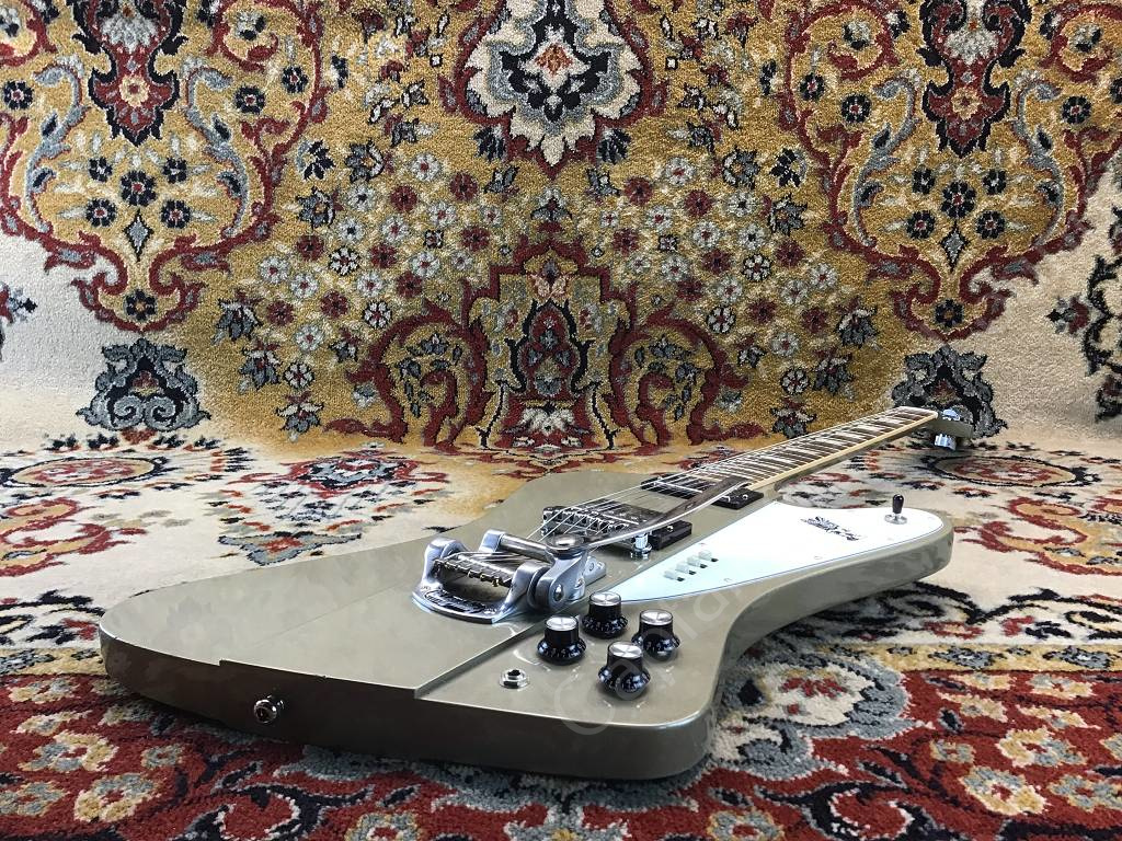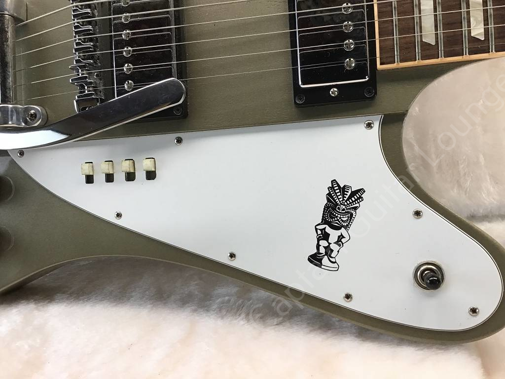 This Firebird is equipped with two Classic '57 humbucker pickups and, in addition to the 3-way toggle switch, has 4 slide switches for Coil-Split-Neck-PU, Coil-Split-Bridge-PU, Out Of Phase (in the middle position of the pickup selector switch) and True Bypass for the Bridge-PU.
