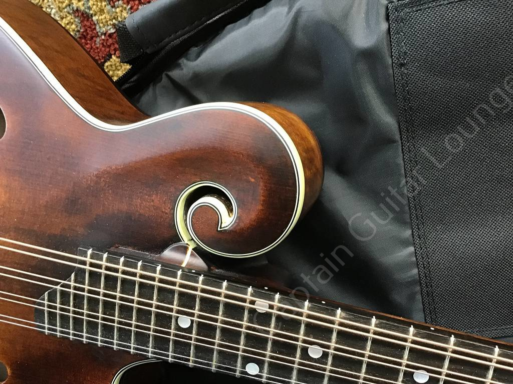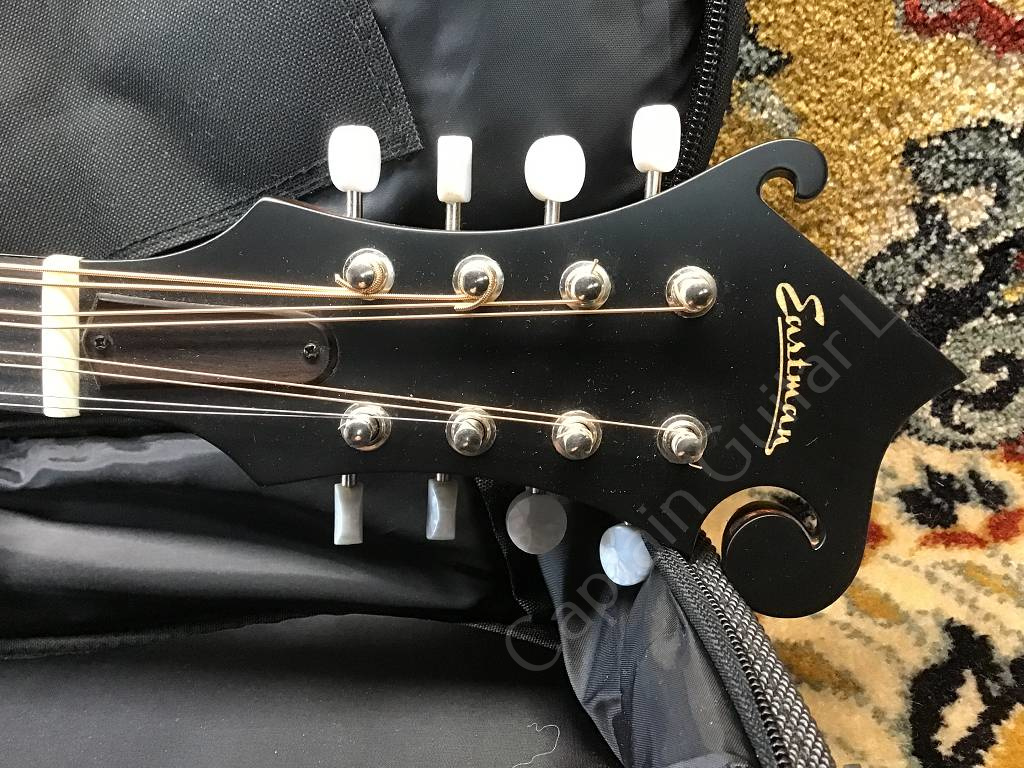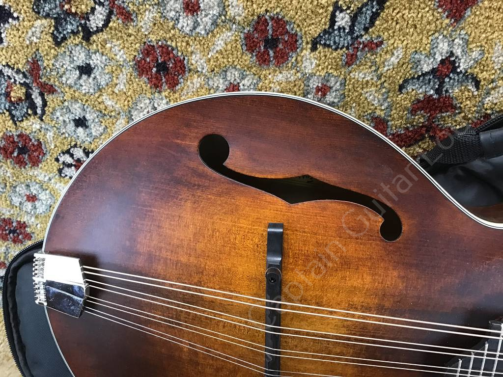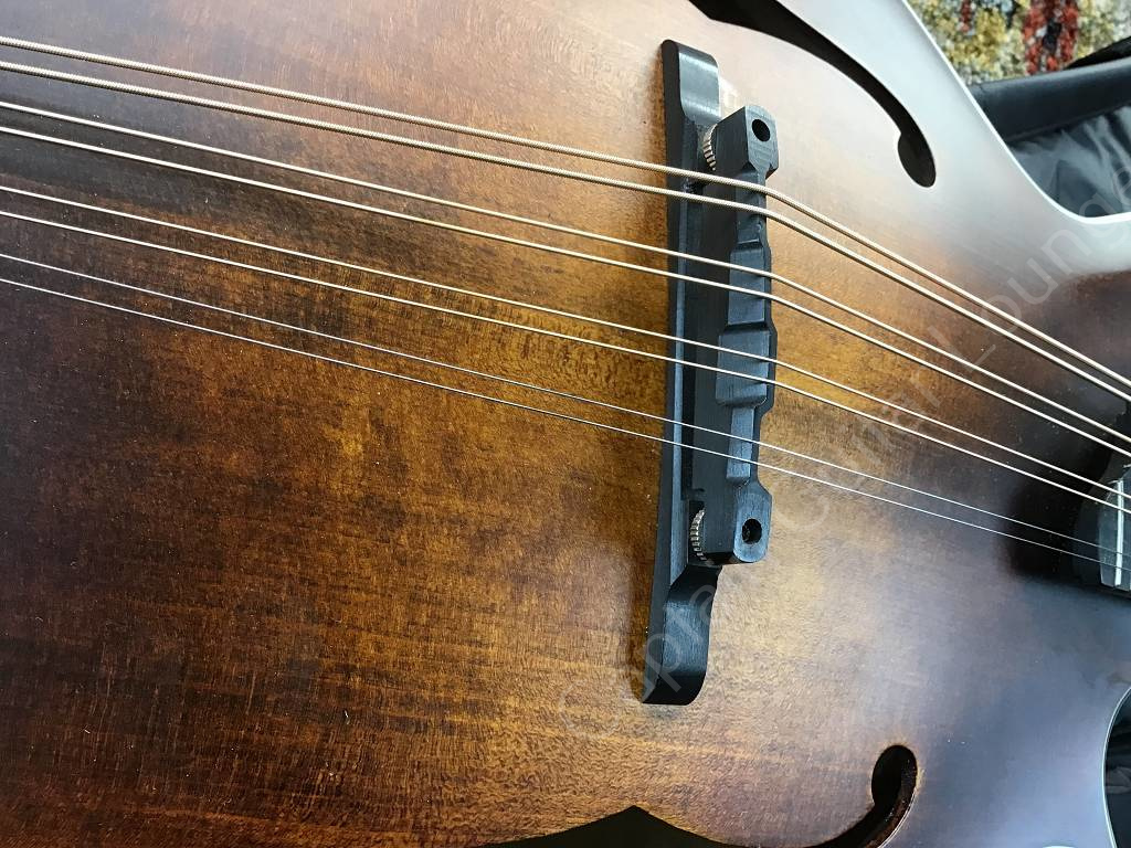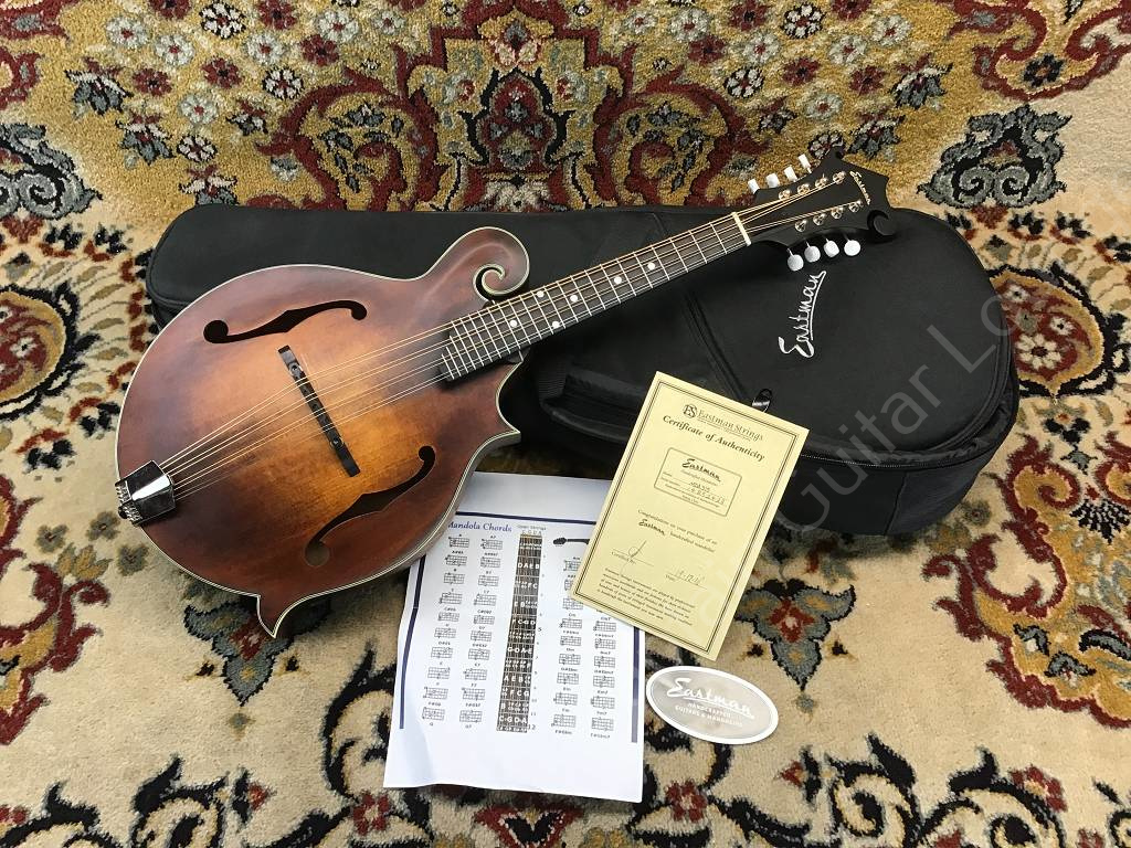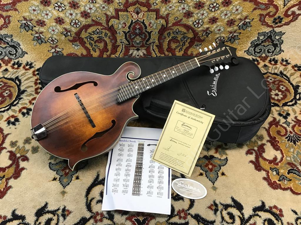 The Eastman MDA315 is a Chinese-made F-style mandola in CGDA tuning. The solid spruce top is combined with grained flamed maple back and sides. The maple neck with a soft V-profile is pleasantly slim and has an ebony fingerboard with a 12″ radius and 23 jumbo frets.