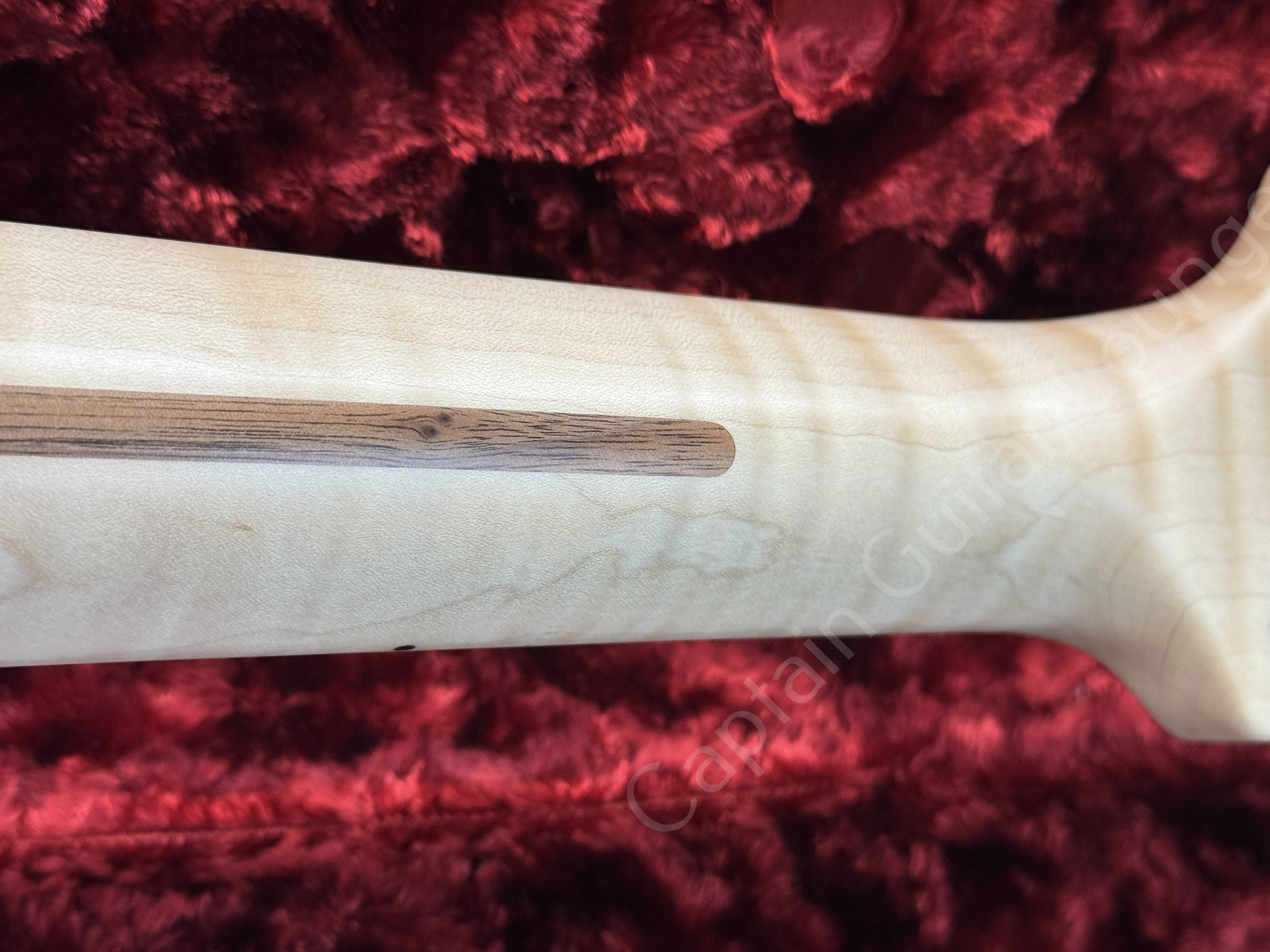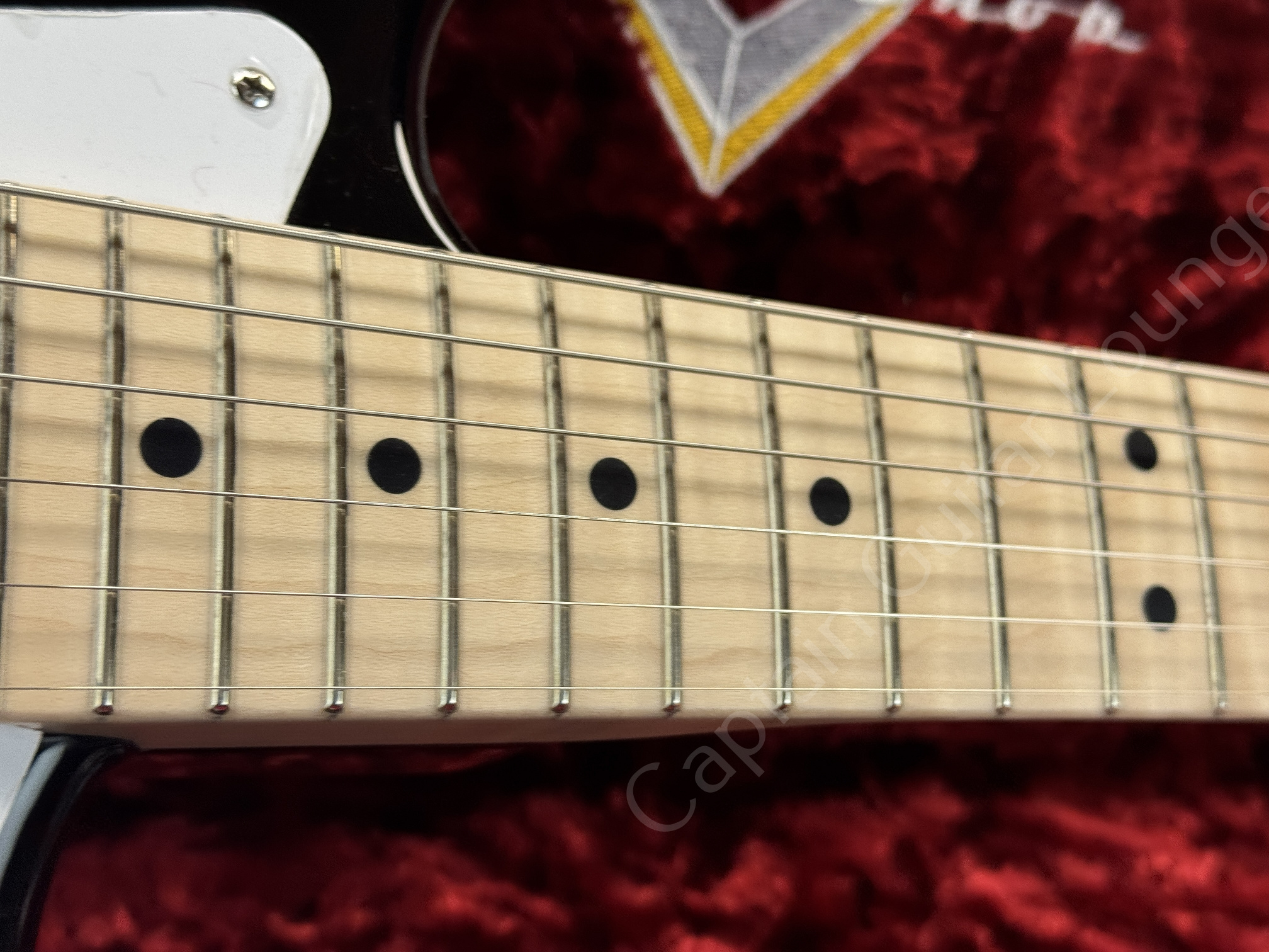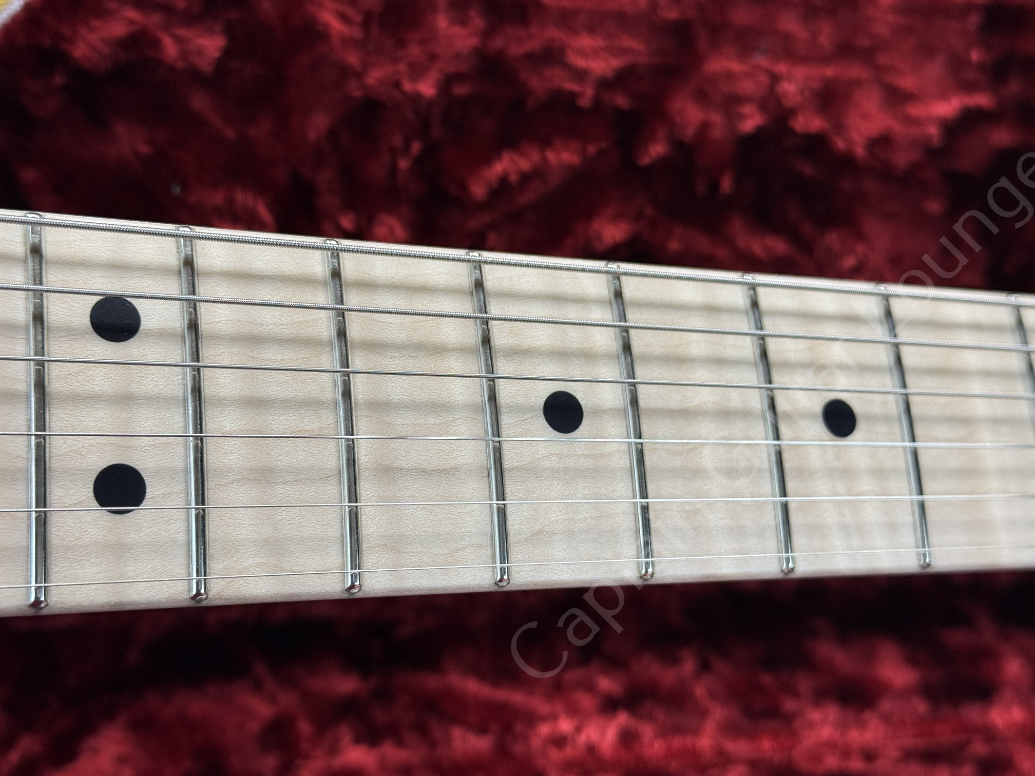 The instrument combines the classic Blackie look in black with an AAA flame maple neck in Clapton V profile, which is really comfortable in the hand.