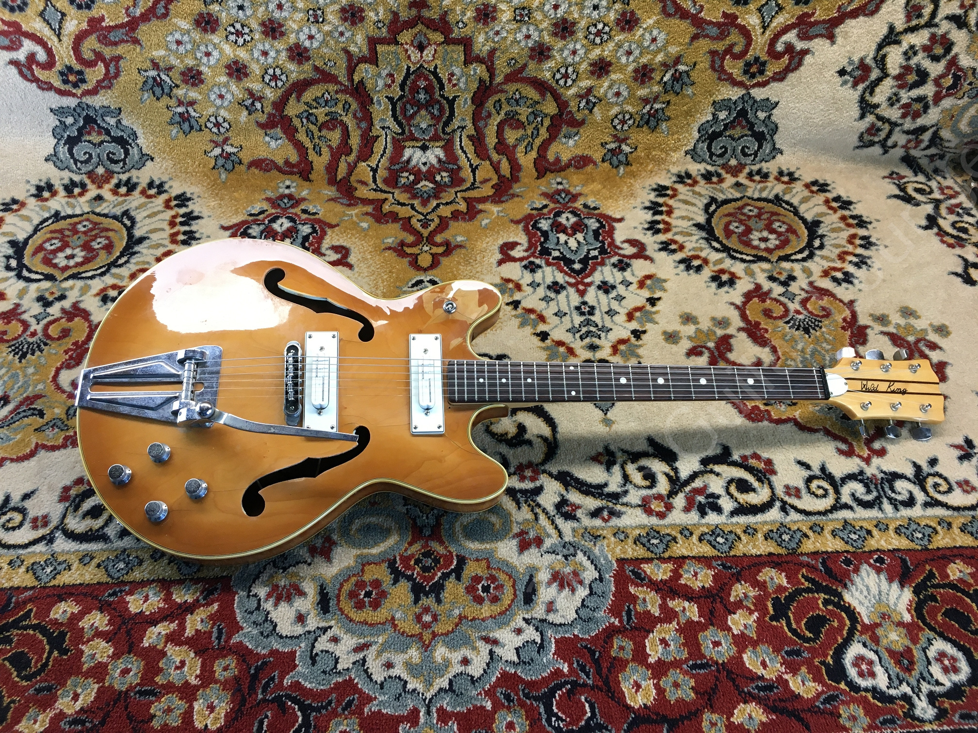 E-Gitarre mit f-Löcher, ohne Centerblock, trägt den Namen Wild Cat, ahnlich einer ES 330 mit Bigsby Style Tremolo."these guitars are made from eko parts, vox parts and others... and then branded whatever name was convenient"