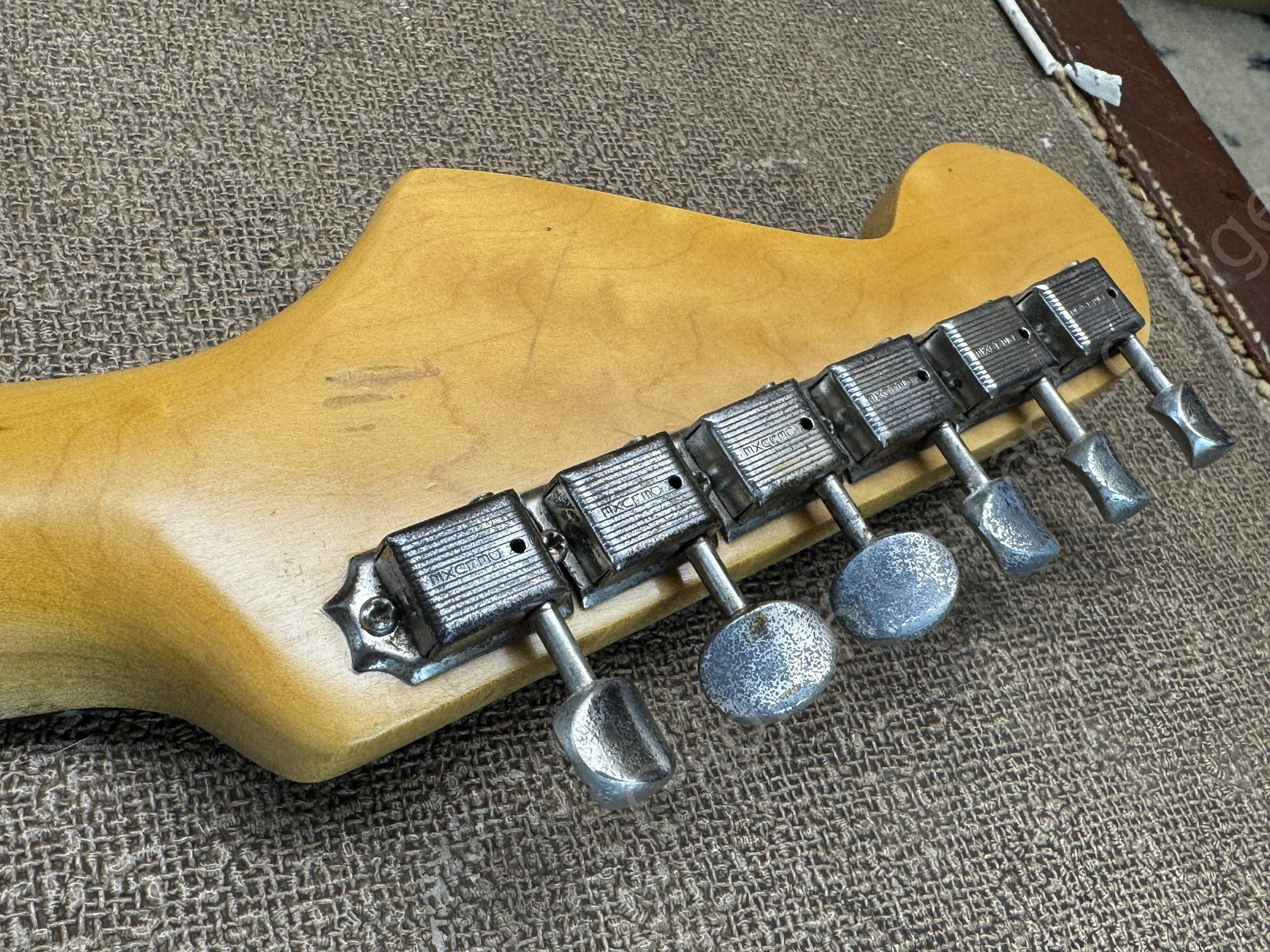 Der Ahornhals mit originalem Pencil Date 9-61 trägt ein Brazilian Rosewood Griffbrett (inkl. CITES), wurde sehr ordentlich neu bundiert.