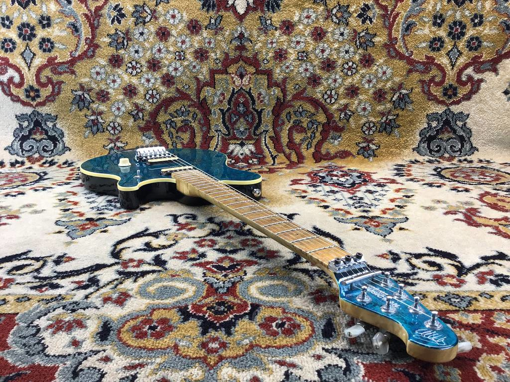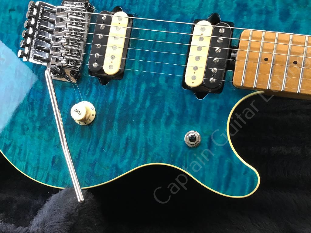 Beim Design und der Hardwarekonfiguration wurde auf Effizienz gesetzt und technischer Schnickschnack weg gelassen. Die beiden custom-wound DiMarzio EVH Humbucker wurden an den Toggle-switch gelötet und dann geht es direkt zum Volume Poti, welcher mit Tone beschriftet ist (genau so wie Eddies). Umso schicker fällt das Holz aus, Wölckchenahorn für die Decke auf einem leichten Lindekorpus mit einem Hals aus Birdseye Maple.