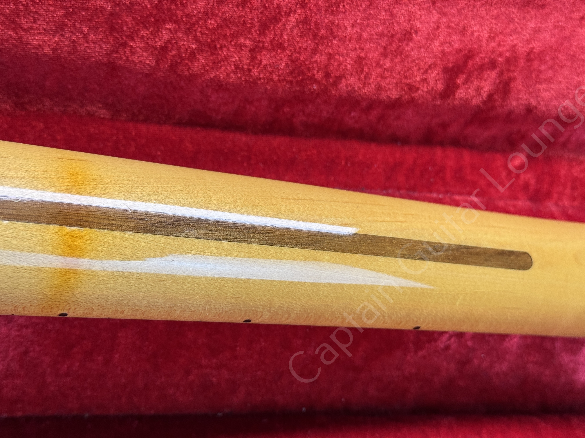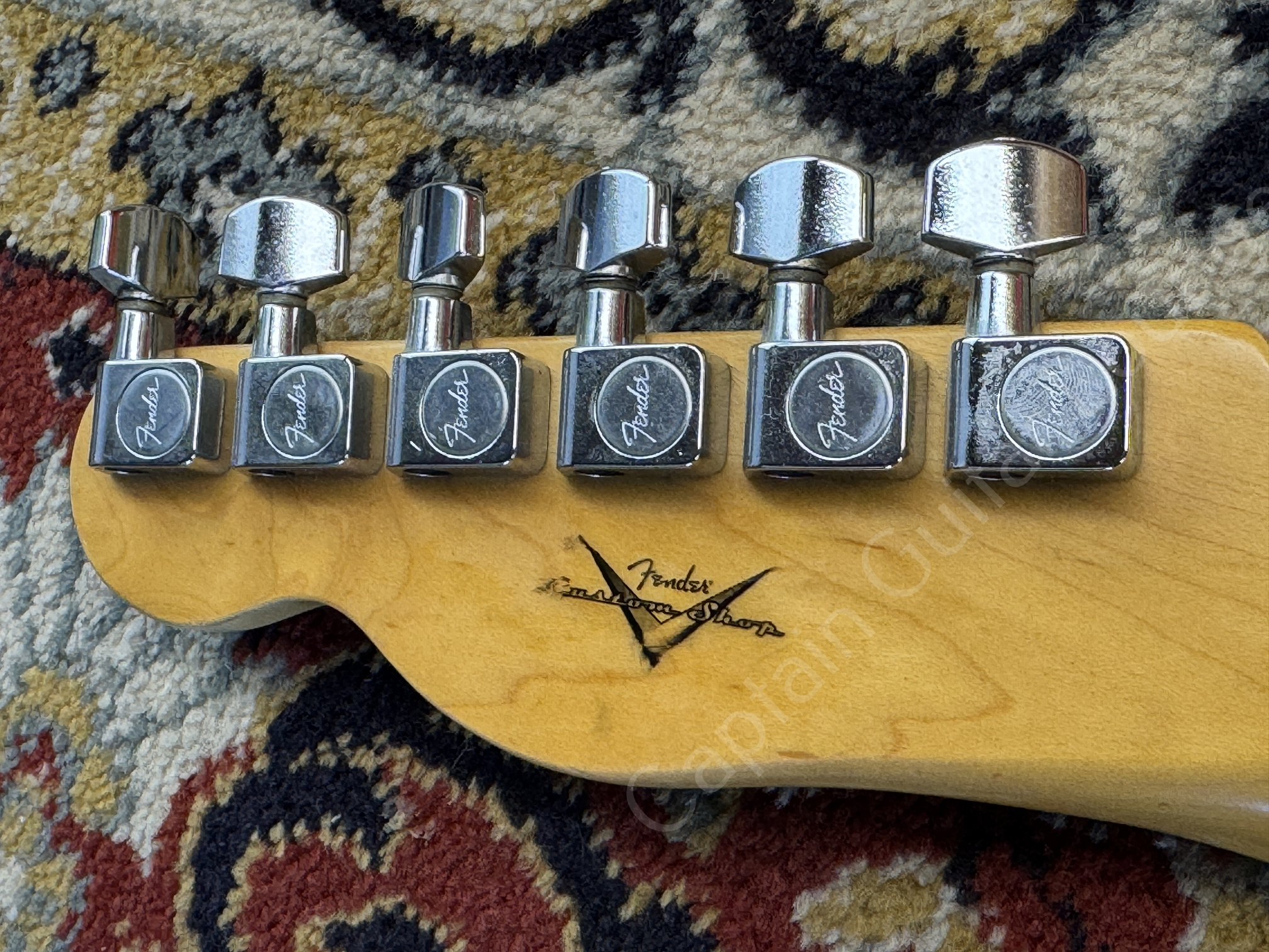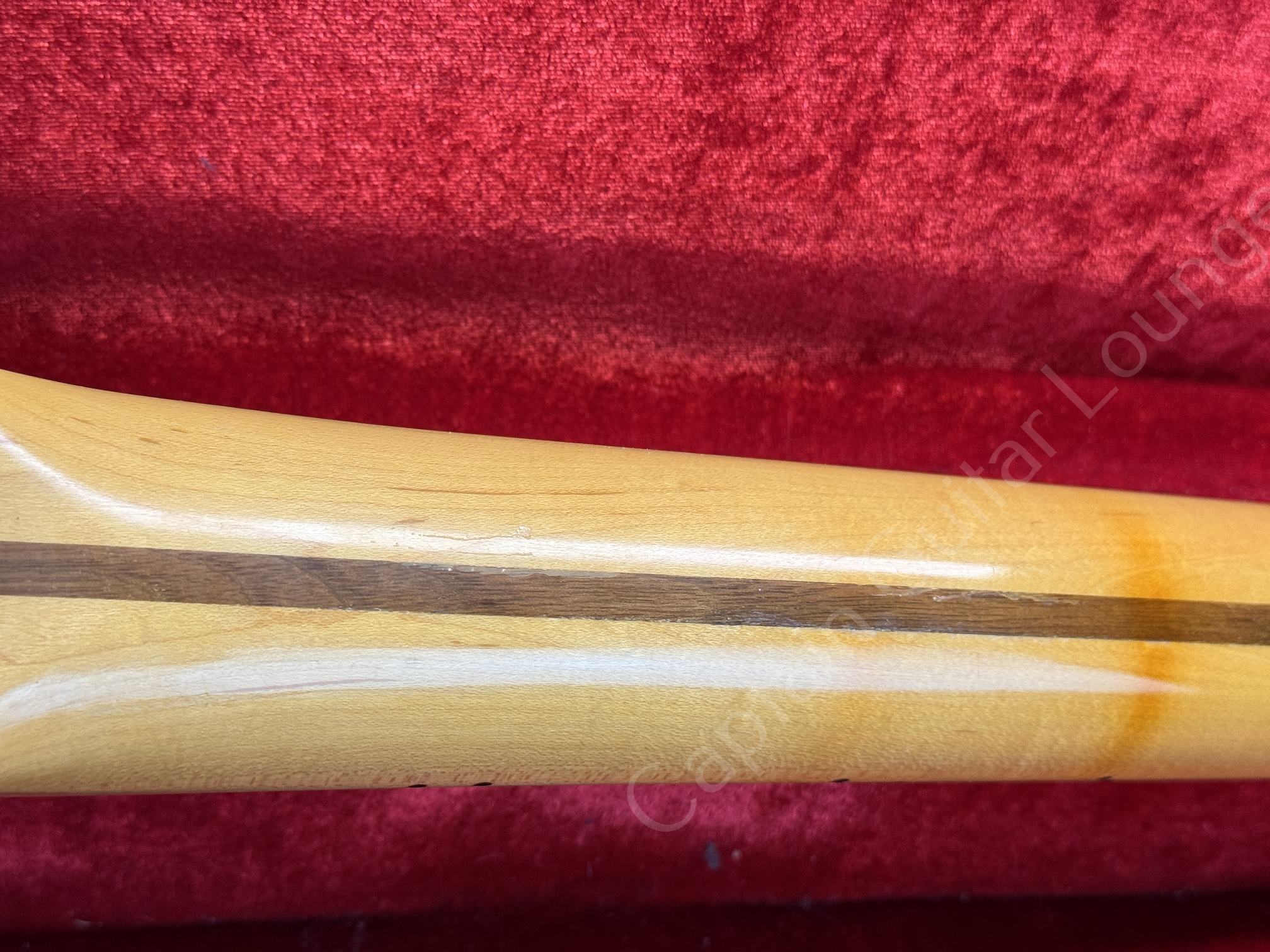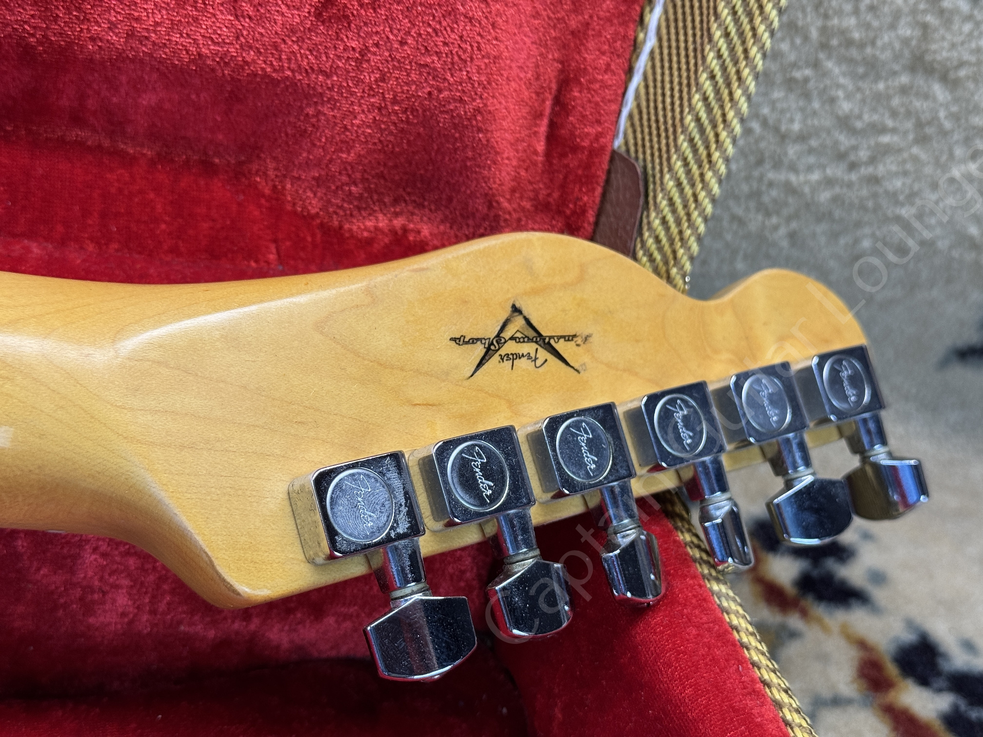 Der Maple Neck mit 22 Jumbo Bünden spielt sich schnell und komfortabel. Gestempelt von Hector Montes, der später als Masterbuilder zum Custom Shop wechselte.