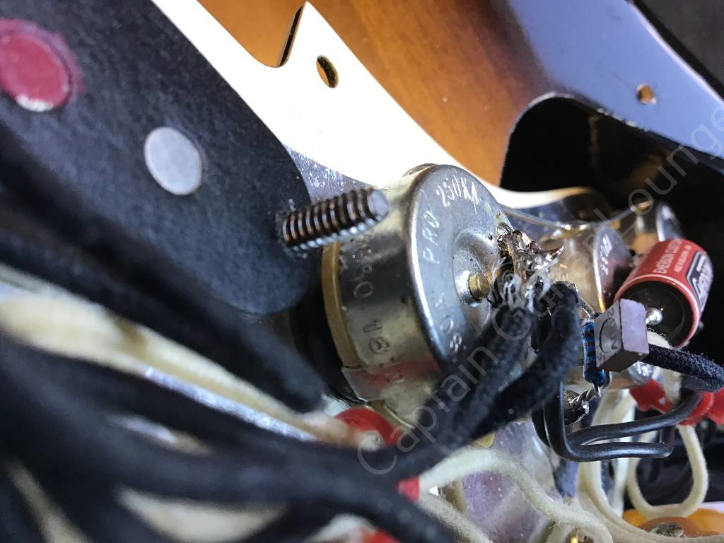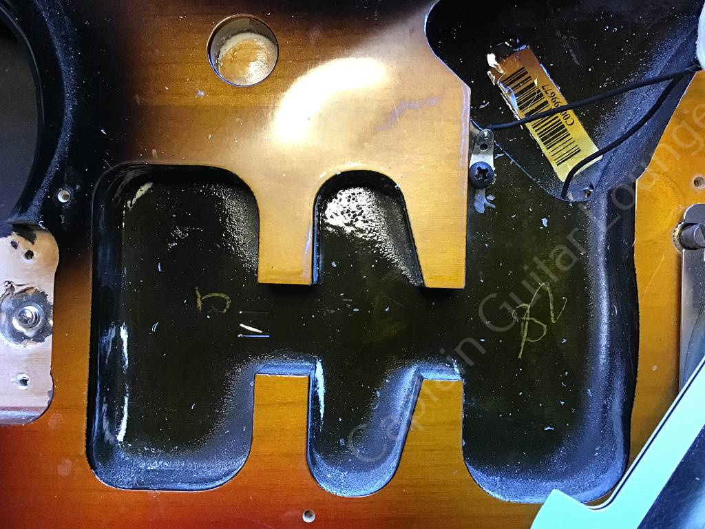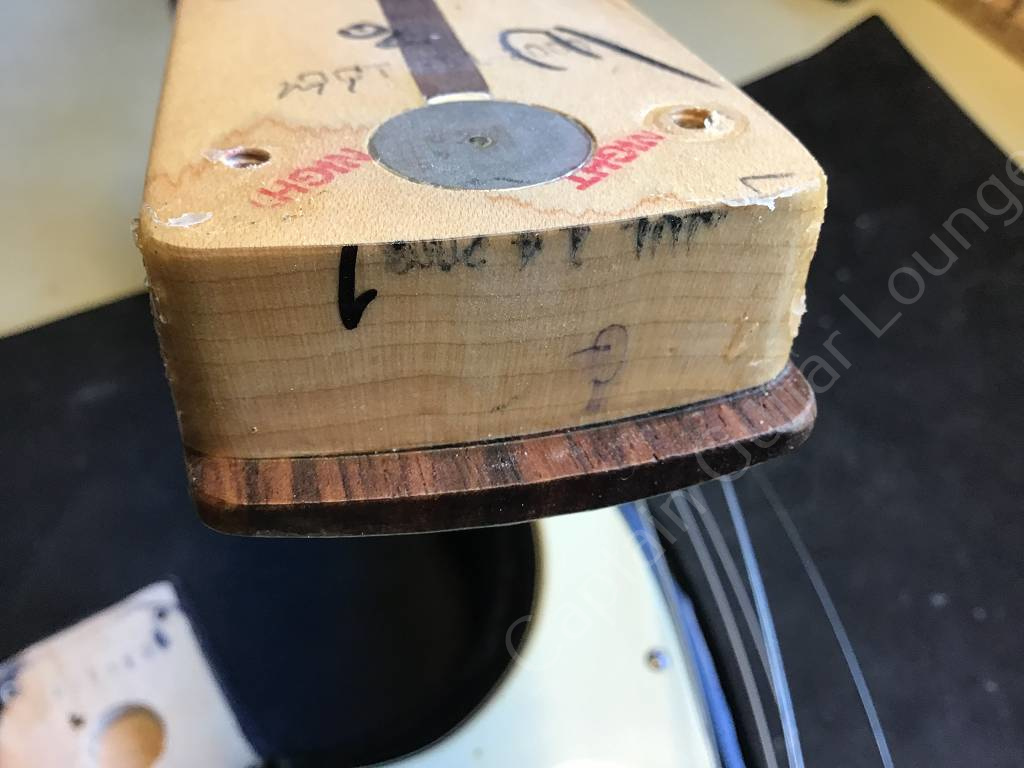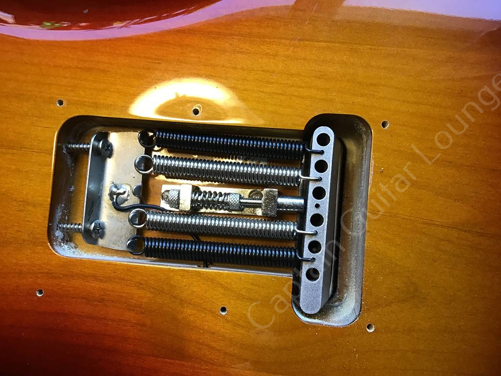 Das Tremolo ist mit einem Tremstop blockiert und der Tremolohebel fehlt.