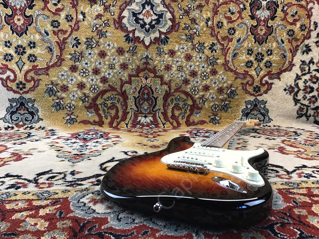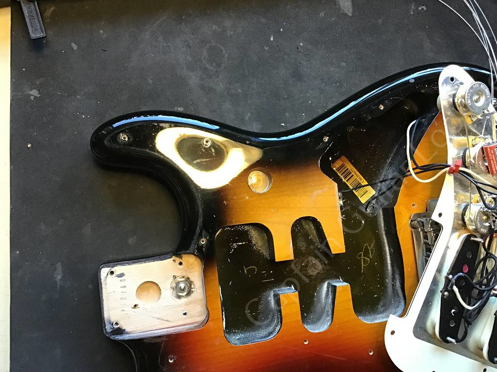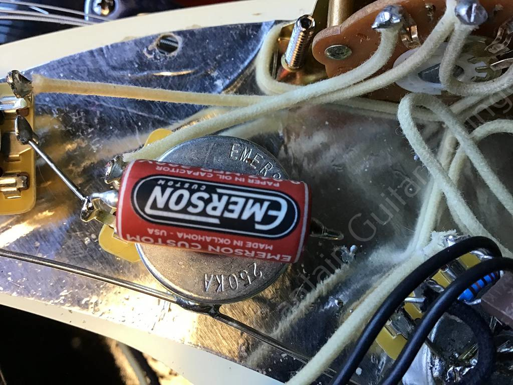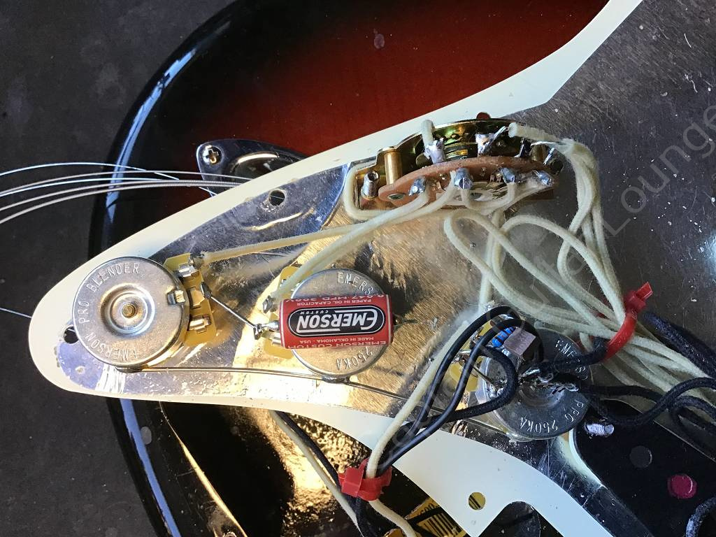 Tonabnehmer und Elektrik wurden mit Fender Custom Shop 54 Pickups und mit einem Emerson Custom 5-Way Stratocaster Prewired Kit aufgepimpt.