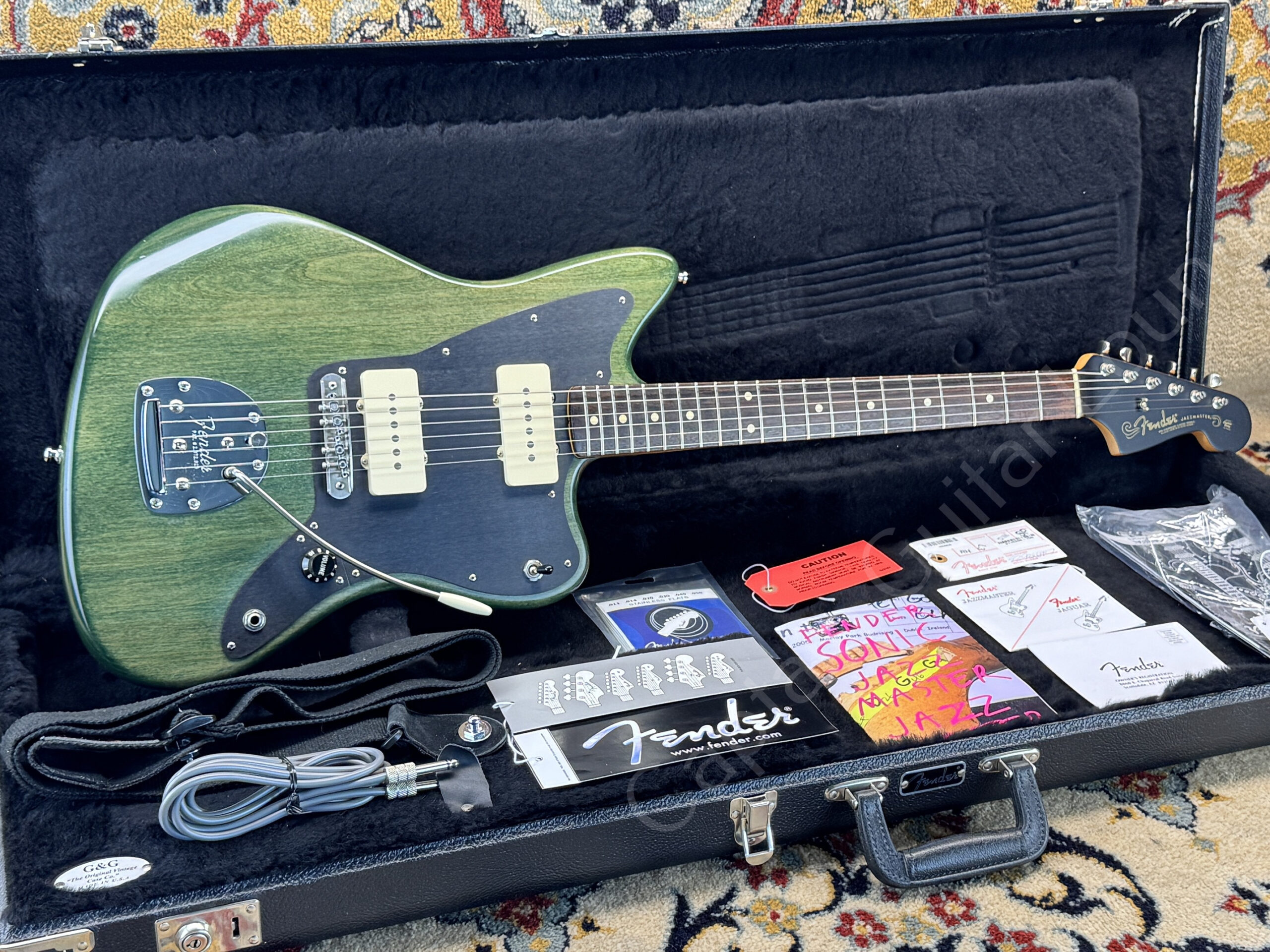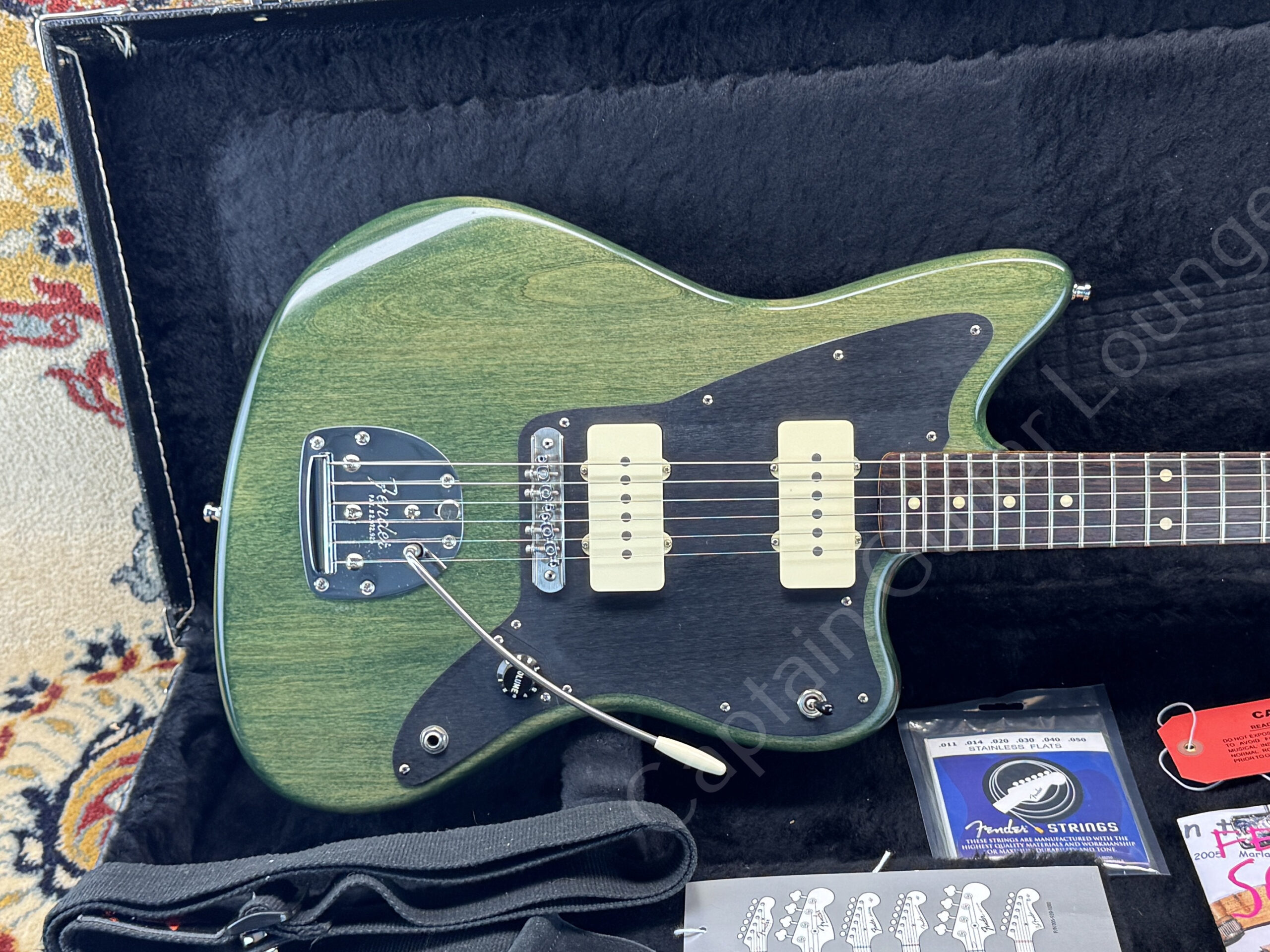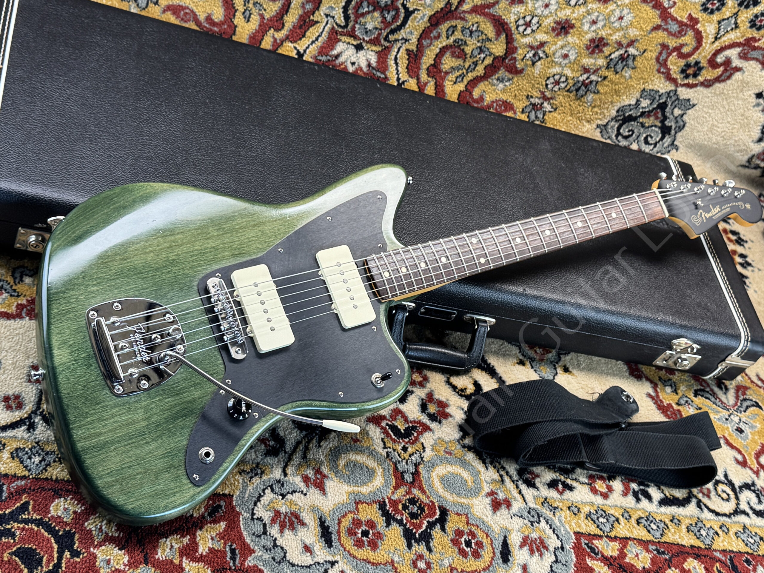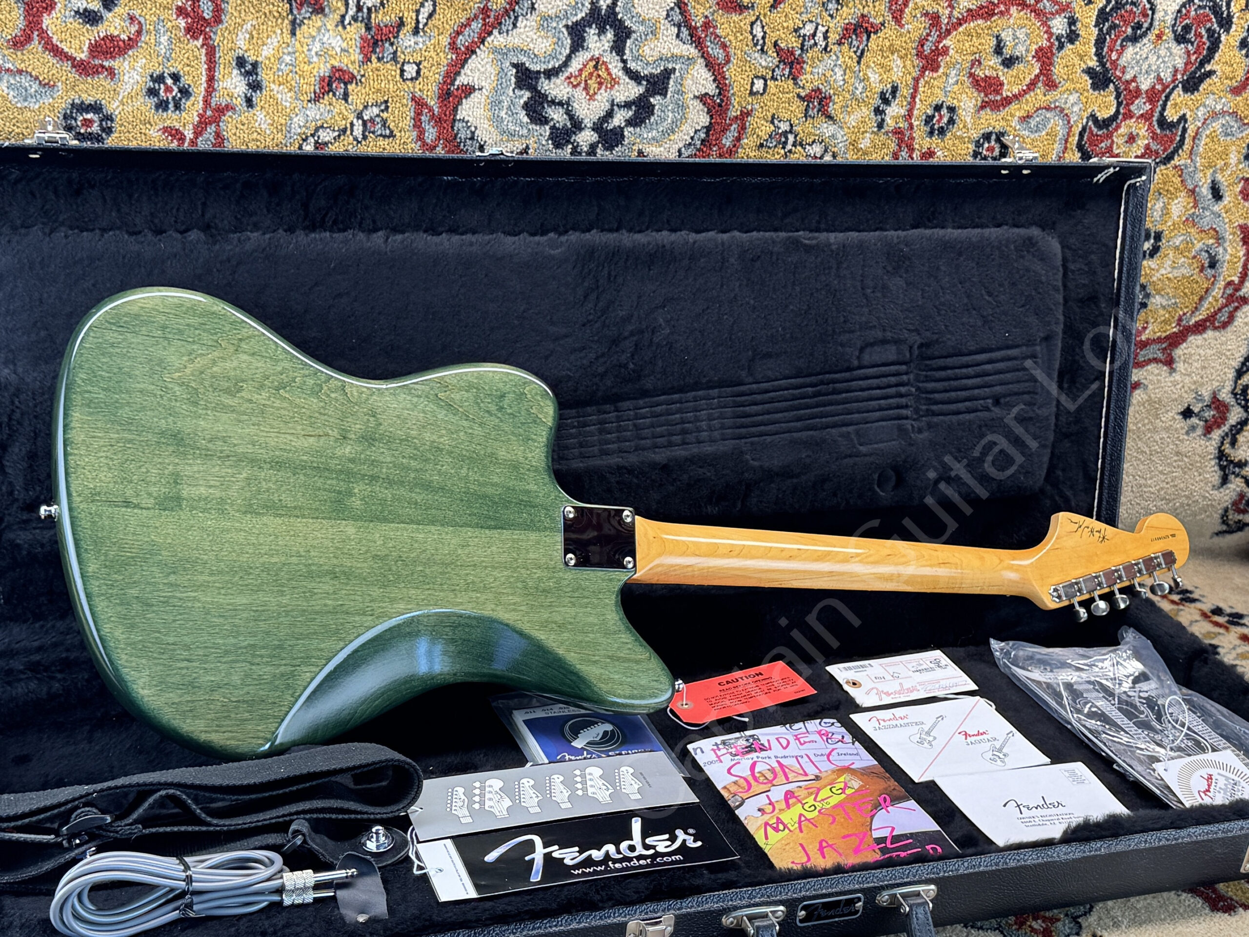 Seltene und äußerst gefragte Fender Thurston Moore Jazzmaster, Signature-Modell des legendären Sonic-Youth-Gitarristen. Diese Gitarre stammt aus 1. Hand und kommt komplett mit original Koffer und Case Candies. Der semi-transparente Forest Green Finish mit matching Headstock verleiht ihr eine edle, zugleich eigenwillige Ausstrahlung - ganz im Stil ihres Namensgebers.