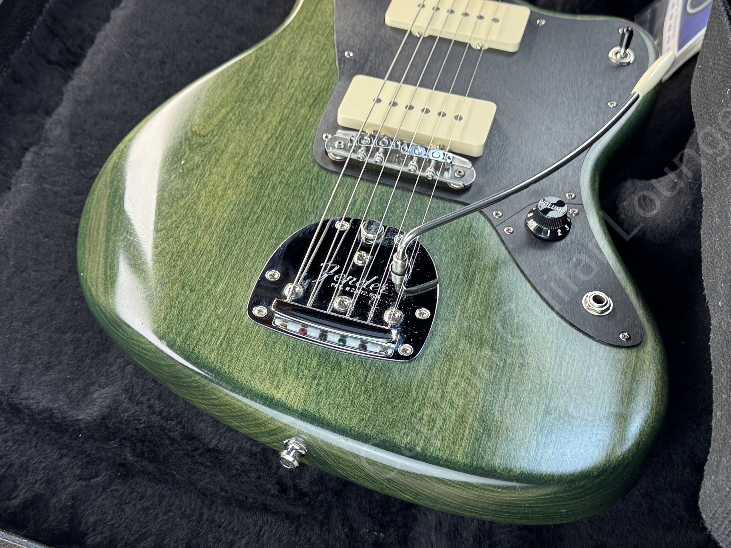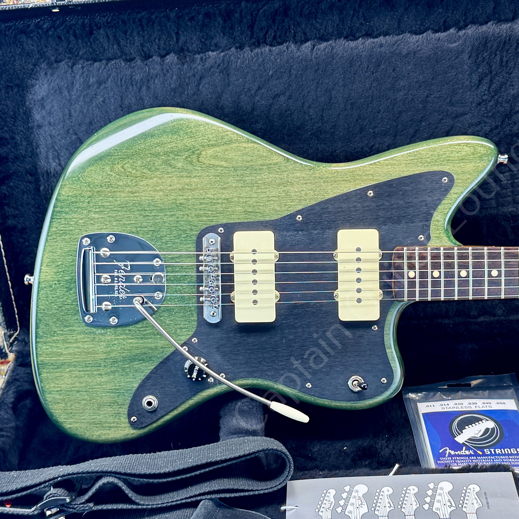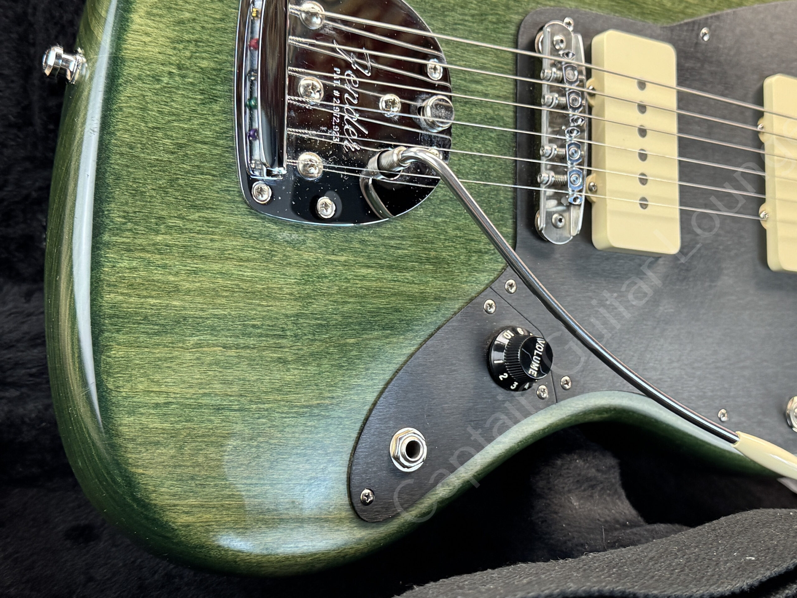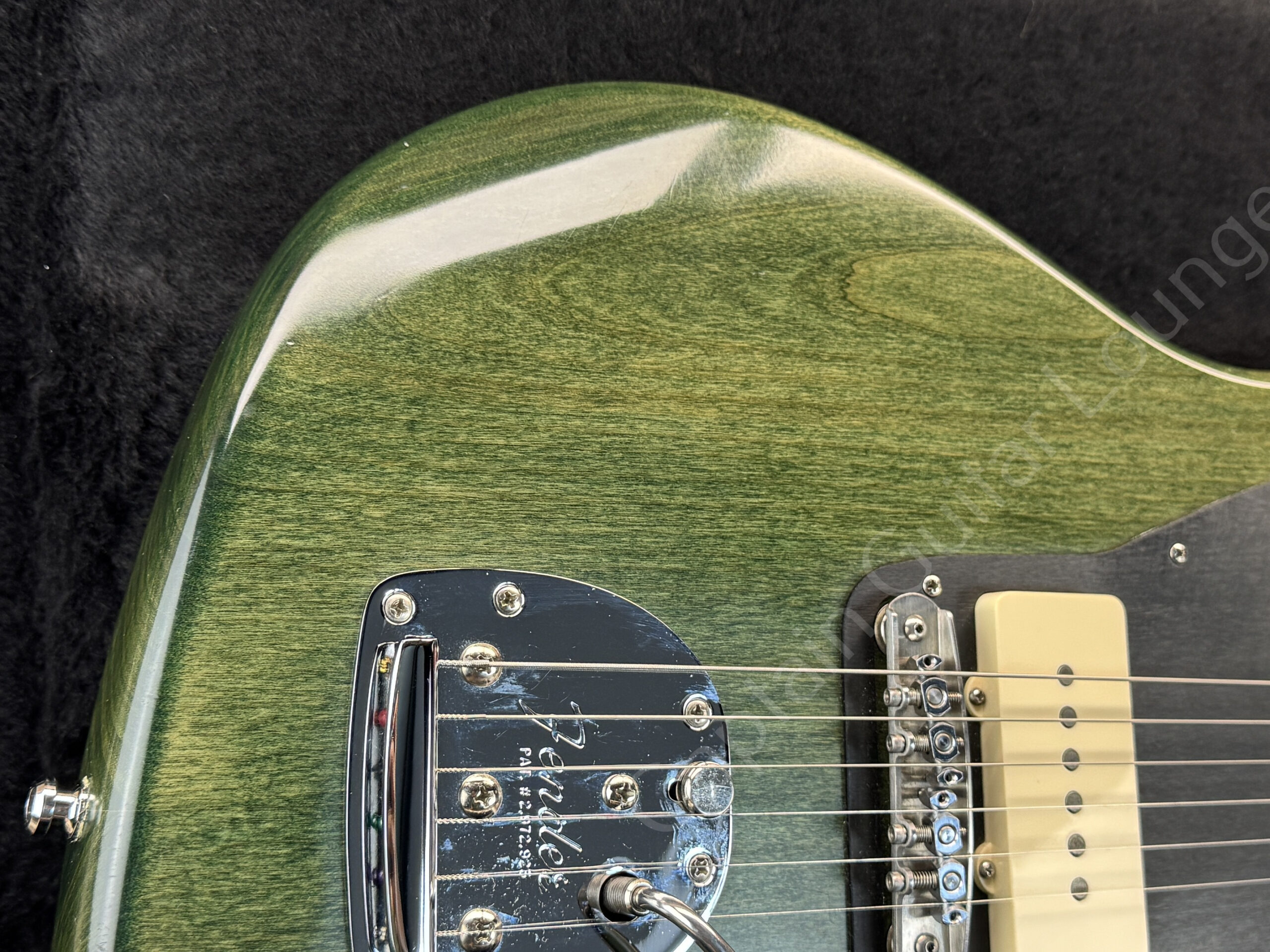Seltene und äußerst gefragte Fender Thurston Moore Jazzmaster, Signature-Modell des legendären Sonic-Youth-Gitarristen. Diese Gitarre stammt aus 1. Hand und kommt komplett mit original Koffer und Case Candies. Der semi-transparente Forest Green Finish mit matching Headstock verleiht ihr eine edle, zugleich eigenwillige Ausstrahlung - ganz im Stil ihres Namensgebers.