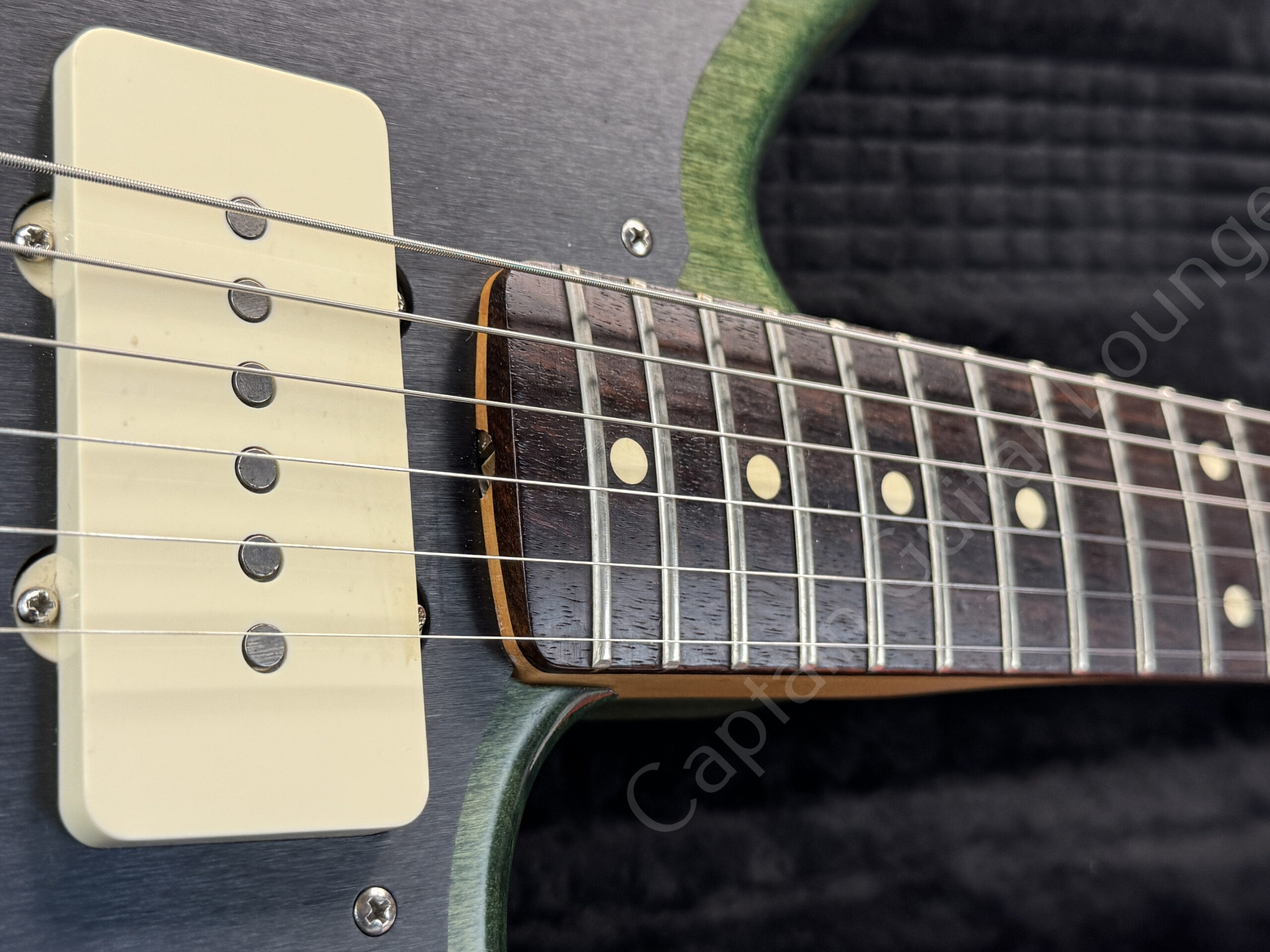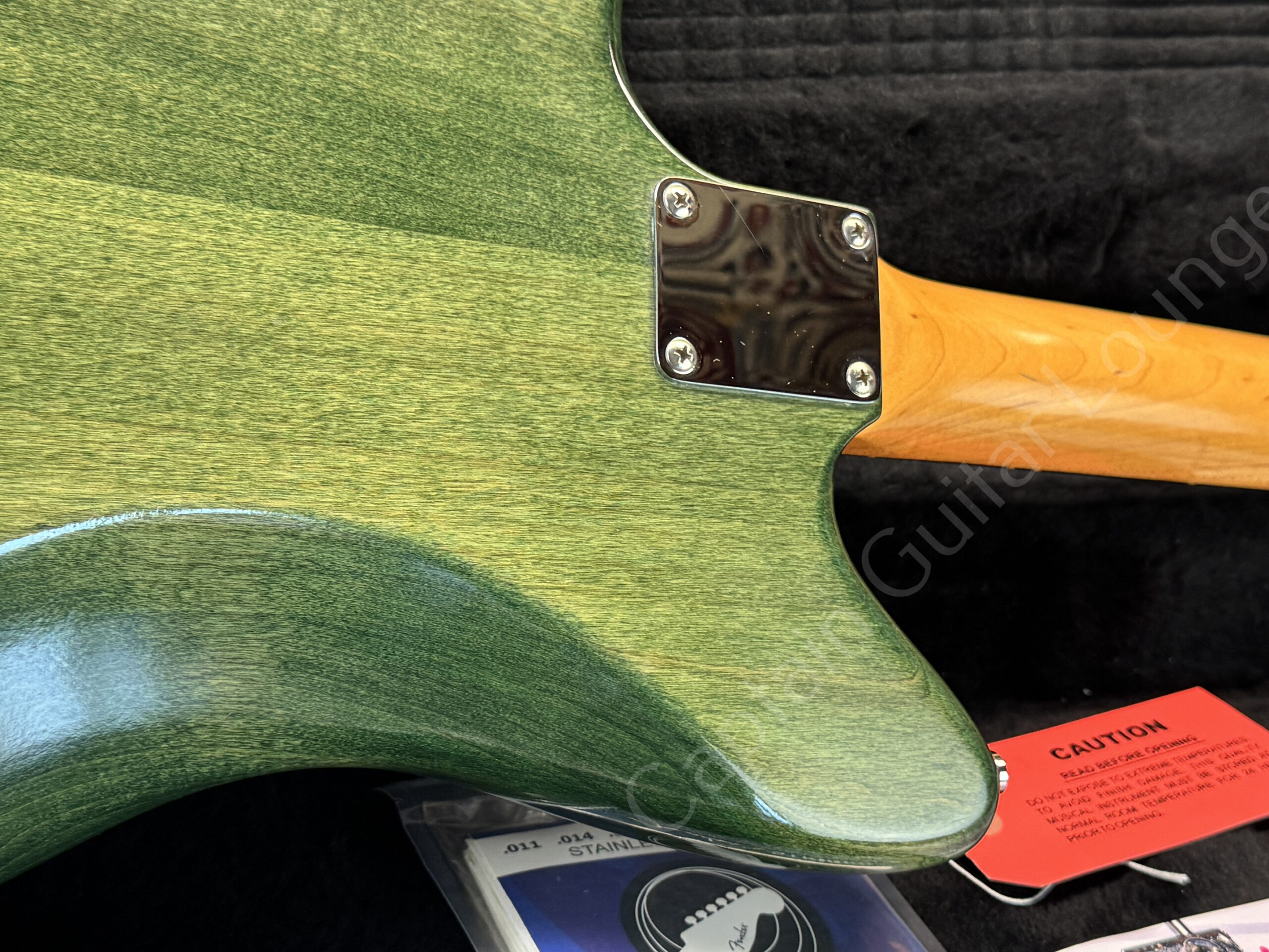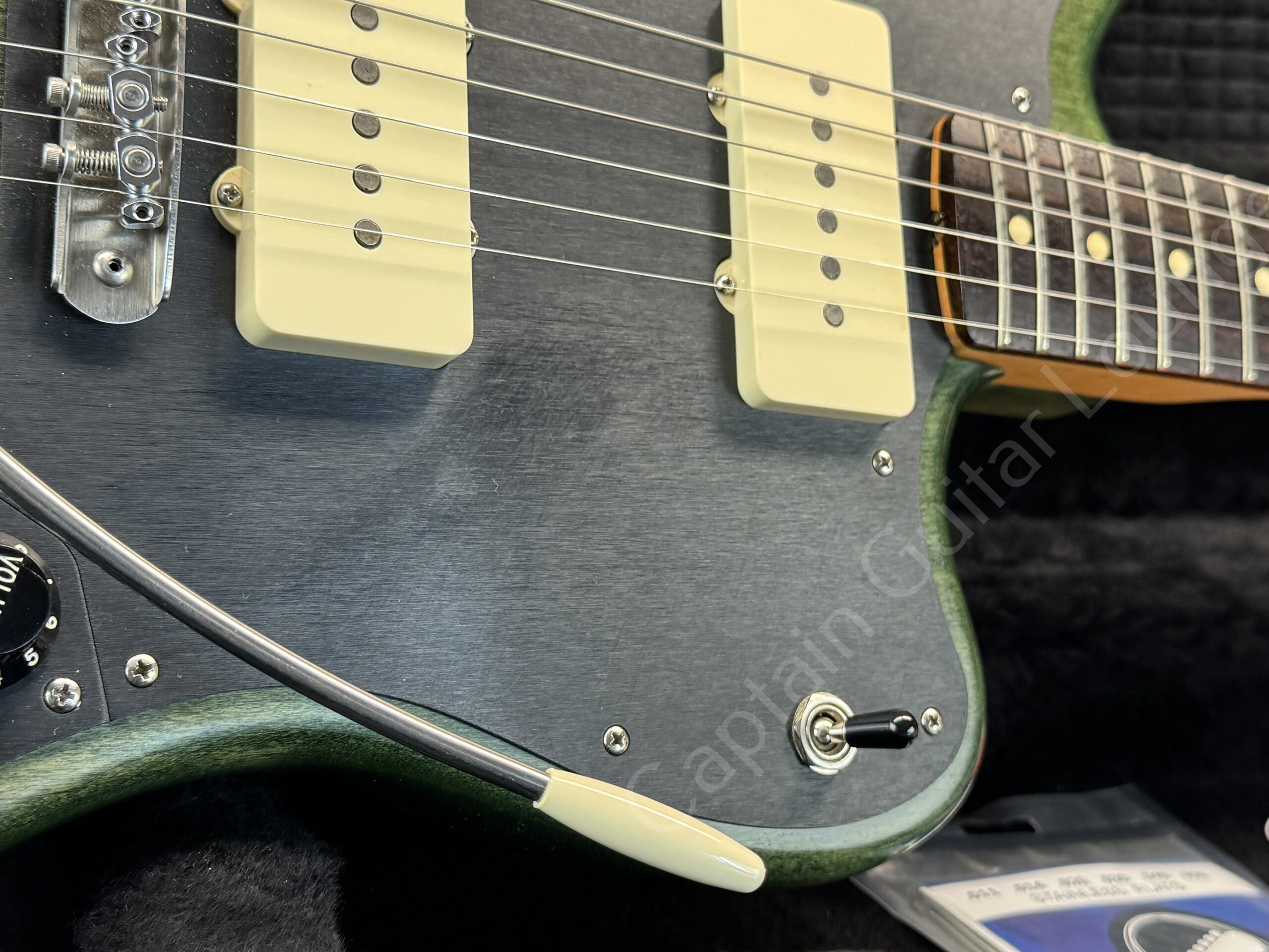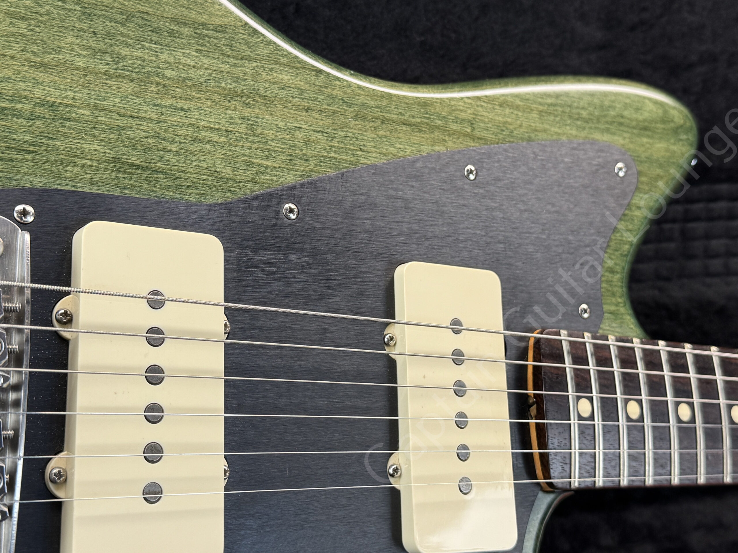 Seltene und äußerst gefragte Fender Thurston Moore Jazzmaster, Signature-Modell des legendären Sonic-Youth-Gitarristen. Diese Gitarre stammt aus 1. Hand und kommt komplett mit original Koffer und Case Candies. Der semi-transparente Forest Green Finish mit matching Headstock verleiht ihr eine edle, zugleich eigenwillige Ausstrahlung - ganz im Stil ihres Namensgebers.