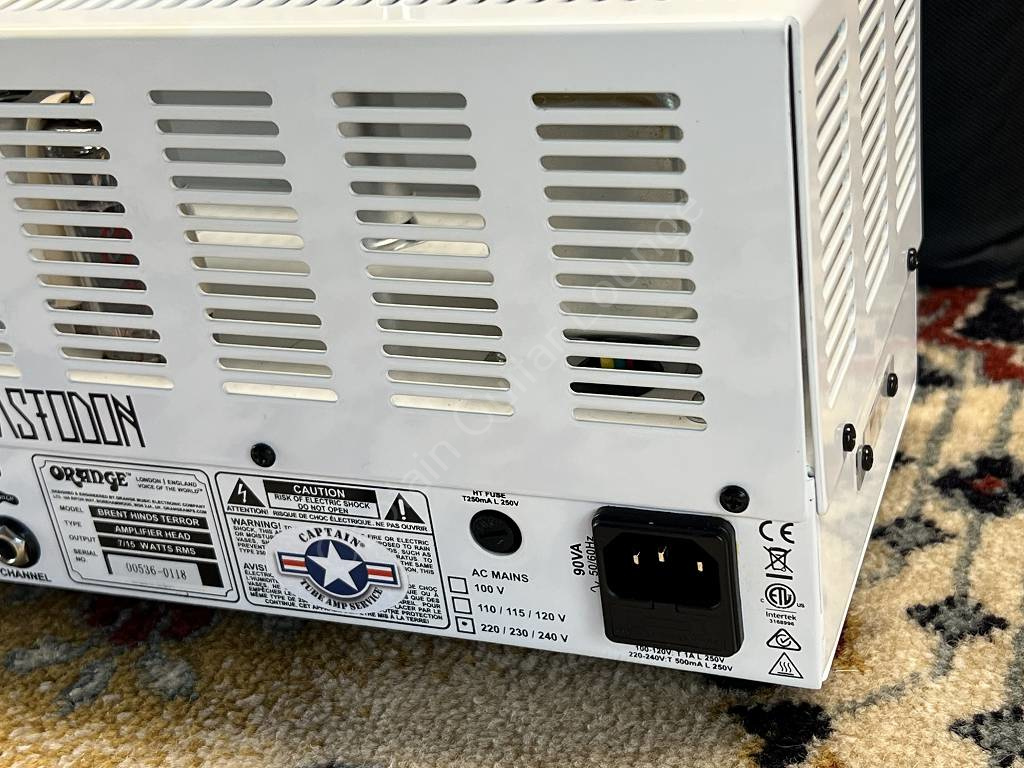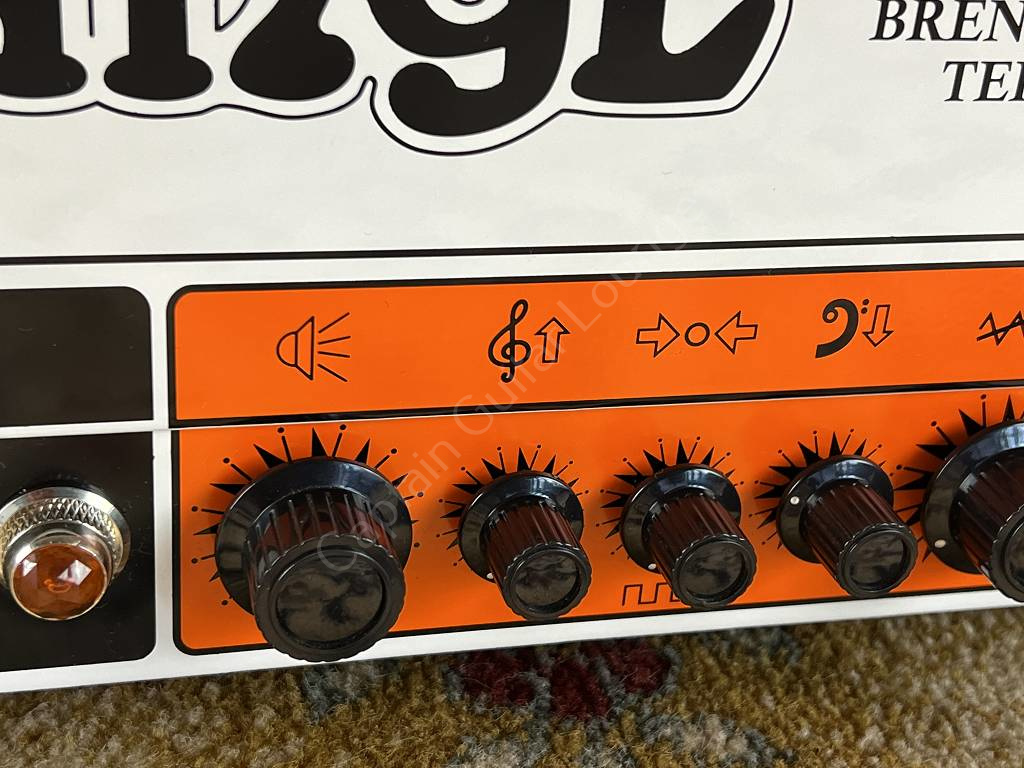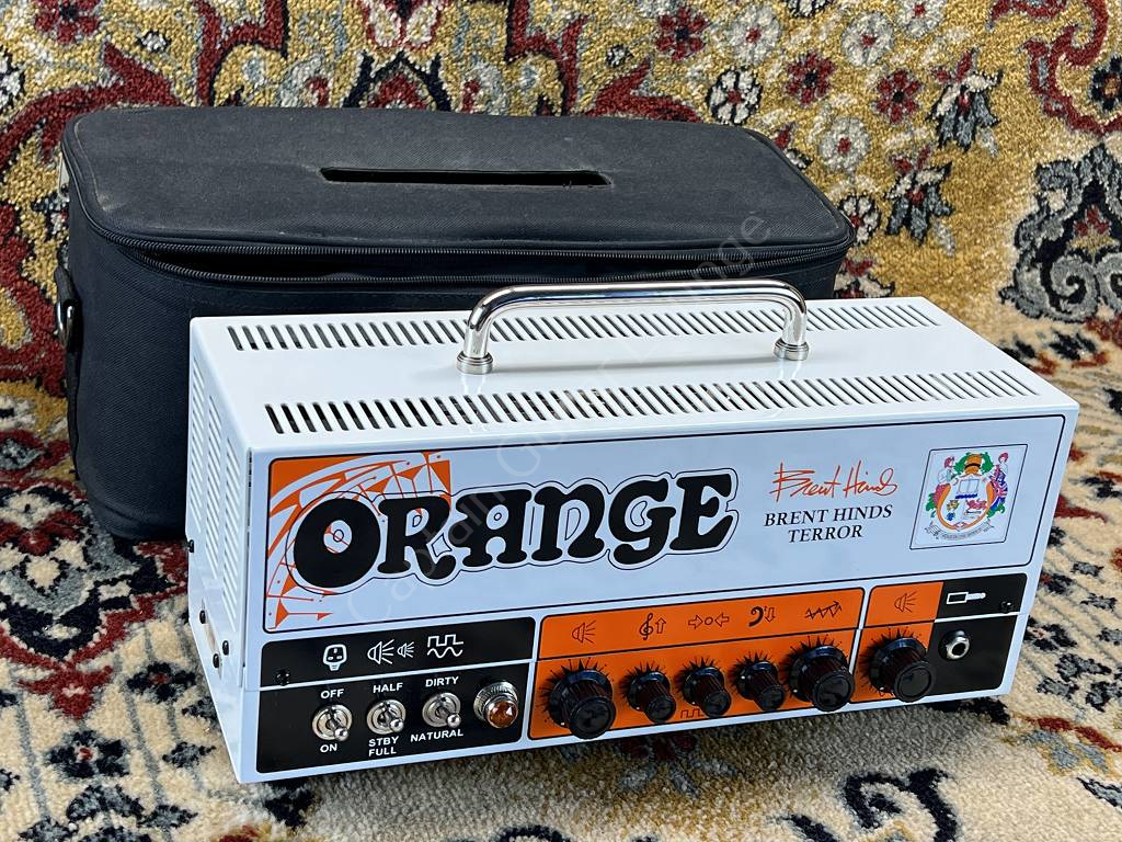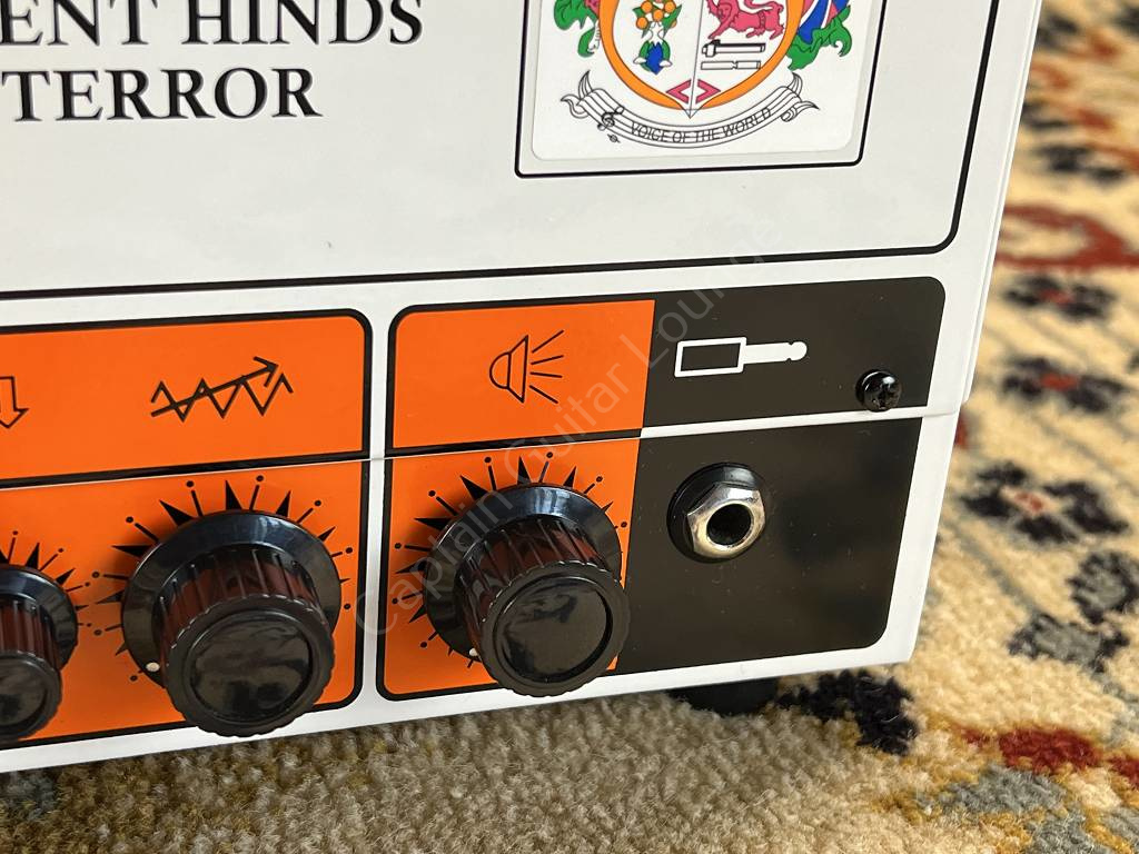 Mit dem Orange Brent Hinds Terror präsentieren das britische Kultunternehmen und der Mastodon-Riffschmied ein gemeinsam entwickeltes Vollröhren-Topteil, das sich trotz des kompakten Formats als wildes Metal-Biest erweist. Durch die besondere Schaltung mit drei Gain-Stages steigert sich der Dirty-Channel mit zunehmendem Gain vom betont brillanten Rhythmus-Sound zur fetten High Gain Distortion, die selbst bei Drop-Tunings jedes Riff mit tighter Präzision ins Ohr meißelt. Darüber hinaus überzeugt der Clean-Kanal mit einer vollen und harmonischen Klangentfaltung. Die aus zwei EL84-Röhren gewonnenen 15 Watt Ausgangsleistung lassen sich dank des "Headroom/Bedroom"-Attenuators außerdem in vier Schritten auf bis zu 0,1 Watt reduzieren.