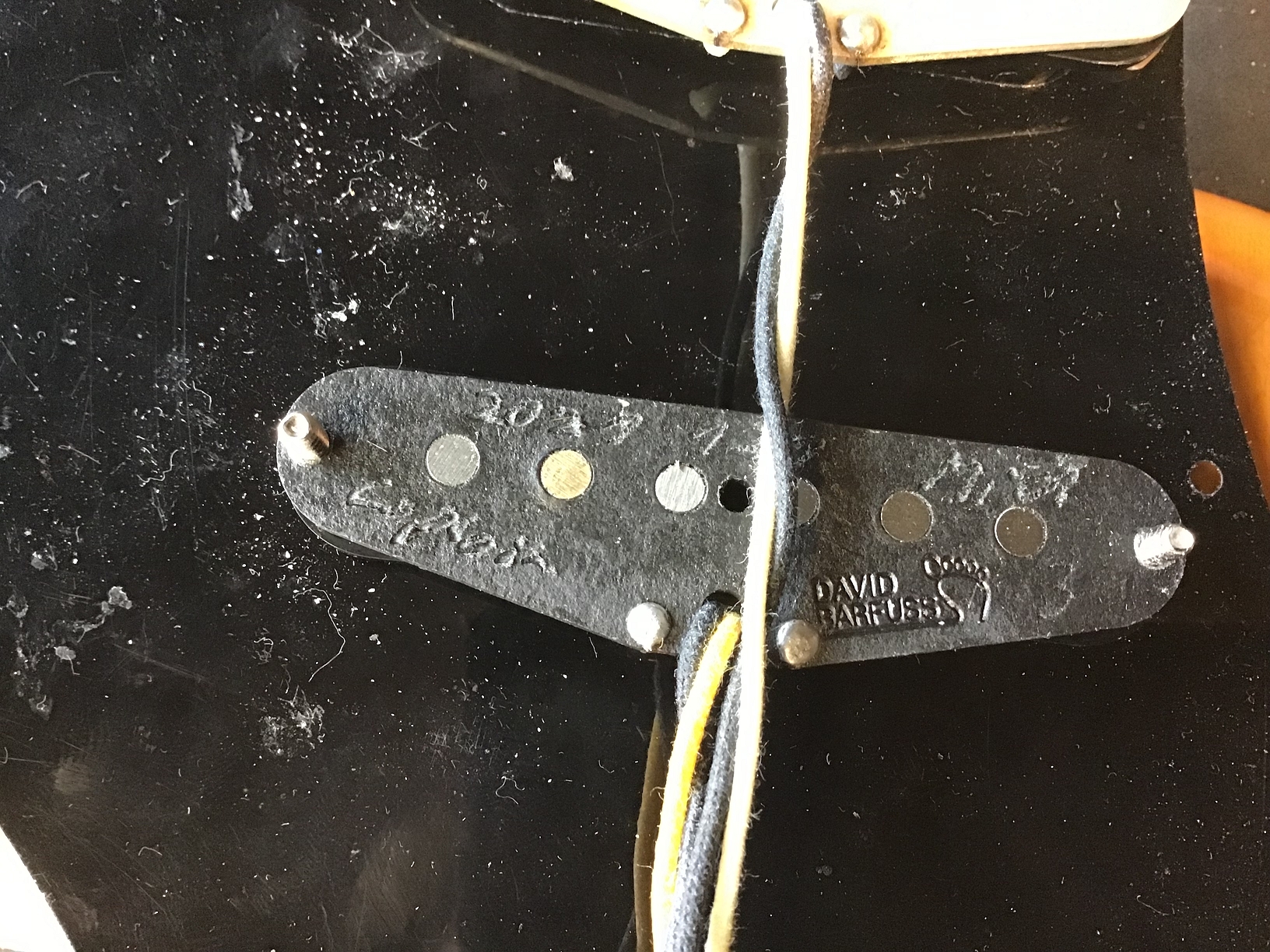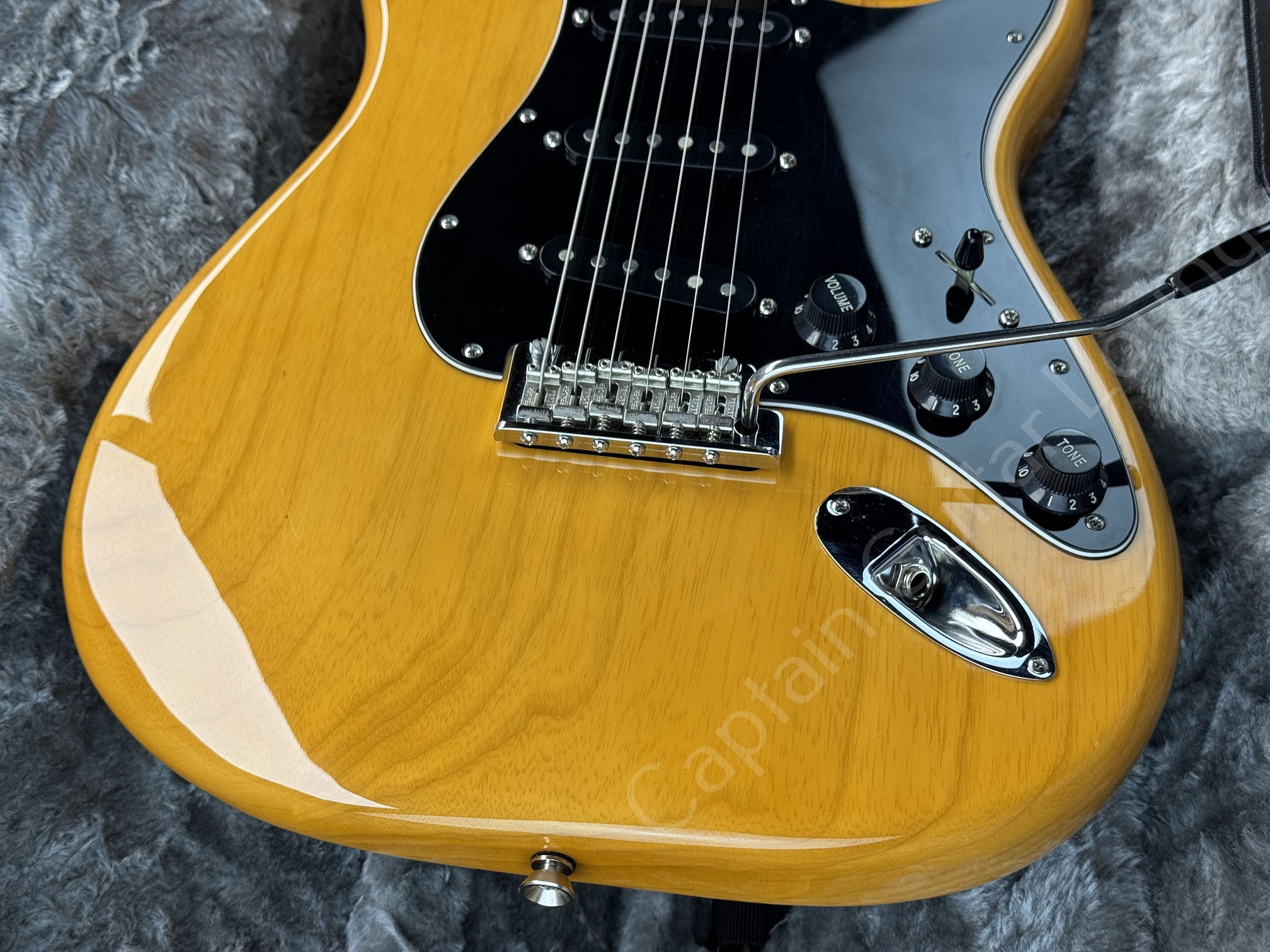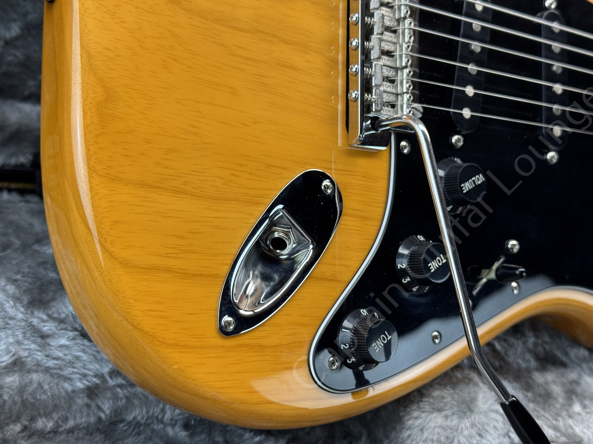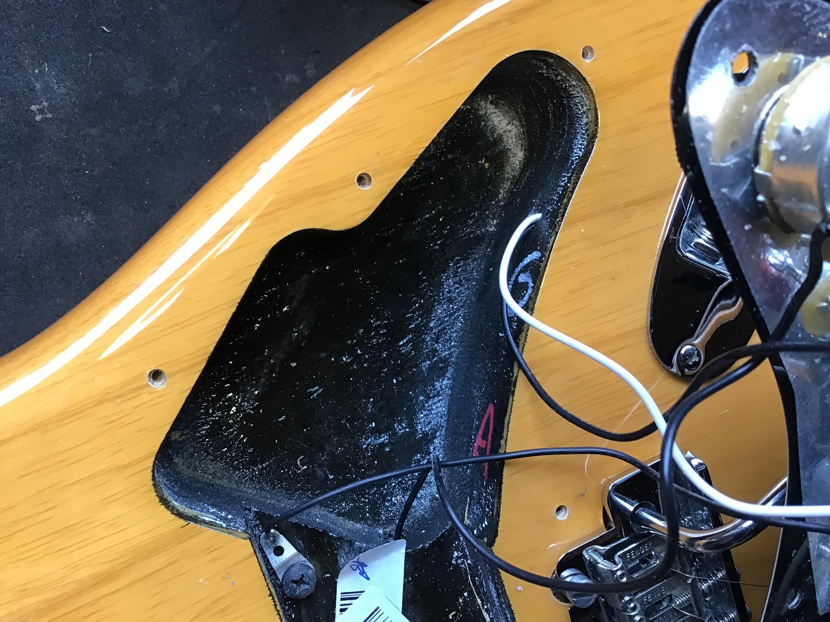 Optisch wurde konsequent auf Schwarz gesetzt: 3-lagiges Pickguard (b/w/b), Backplate, Pickupkappen, Regler, Switchtip und Tremoloarmkappe. Die Originalteile sind nicht mehr vorhanden.