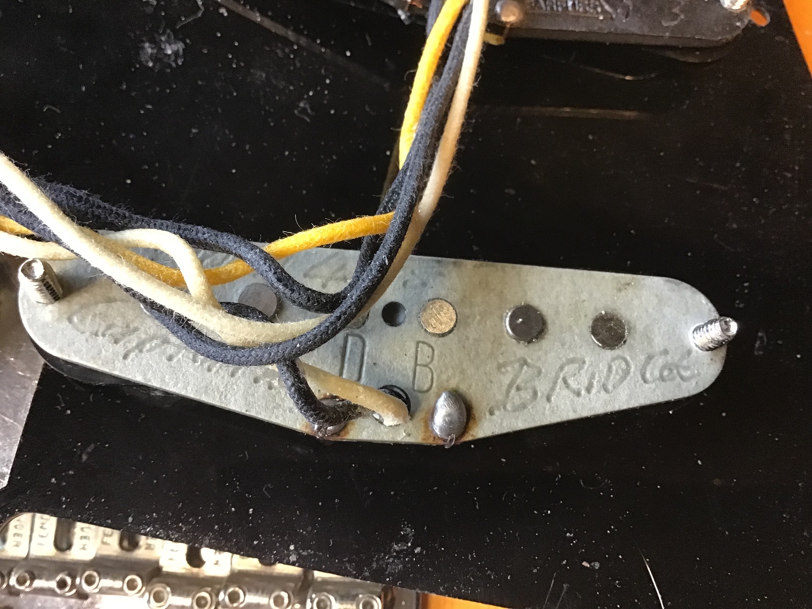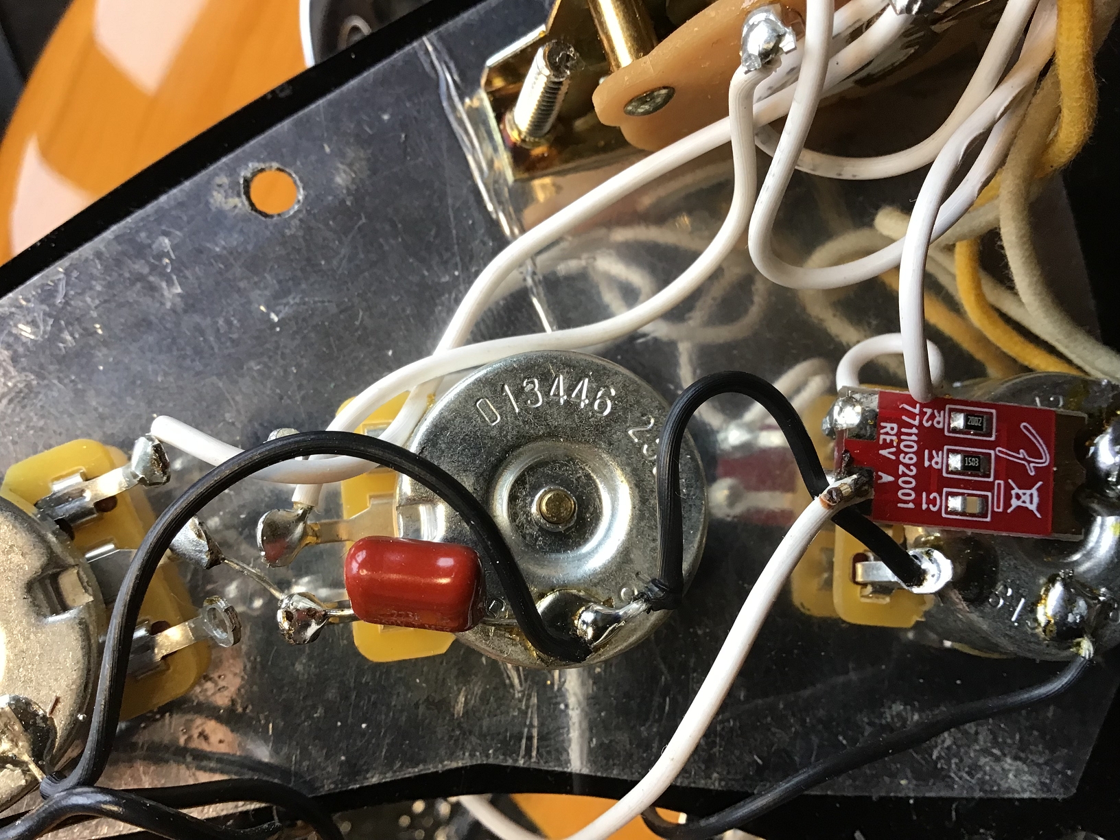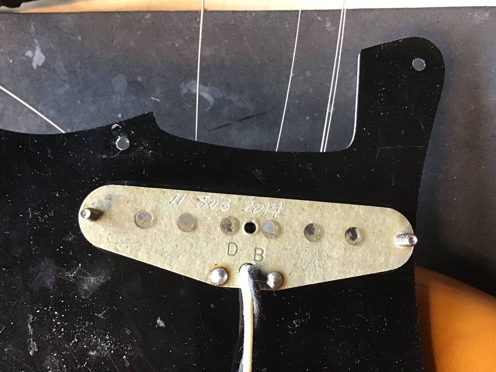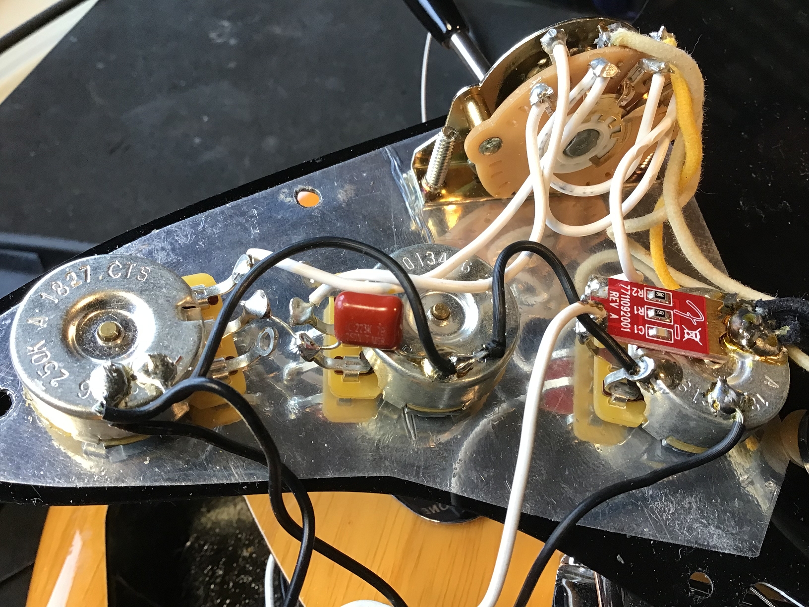 Optisch wurde konsequent auf Schwarz gesetzt: 3-lagiges Pickguard (b/w/b), Backplate, Pickupkappen, Regler, Switchtip und Tremoloarmkappe. Die Originalteile sind nicht mehr vorhanden.