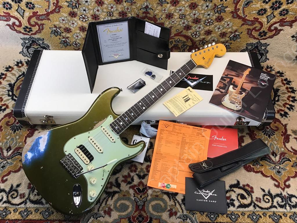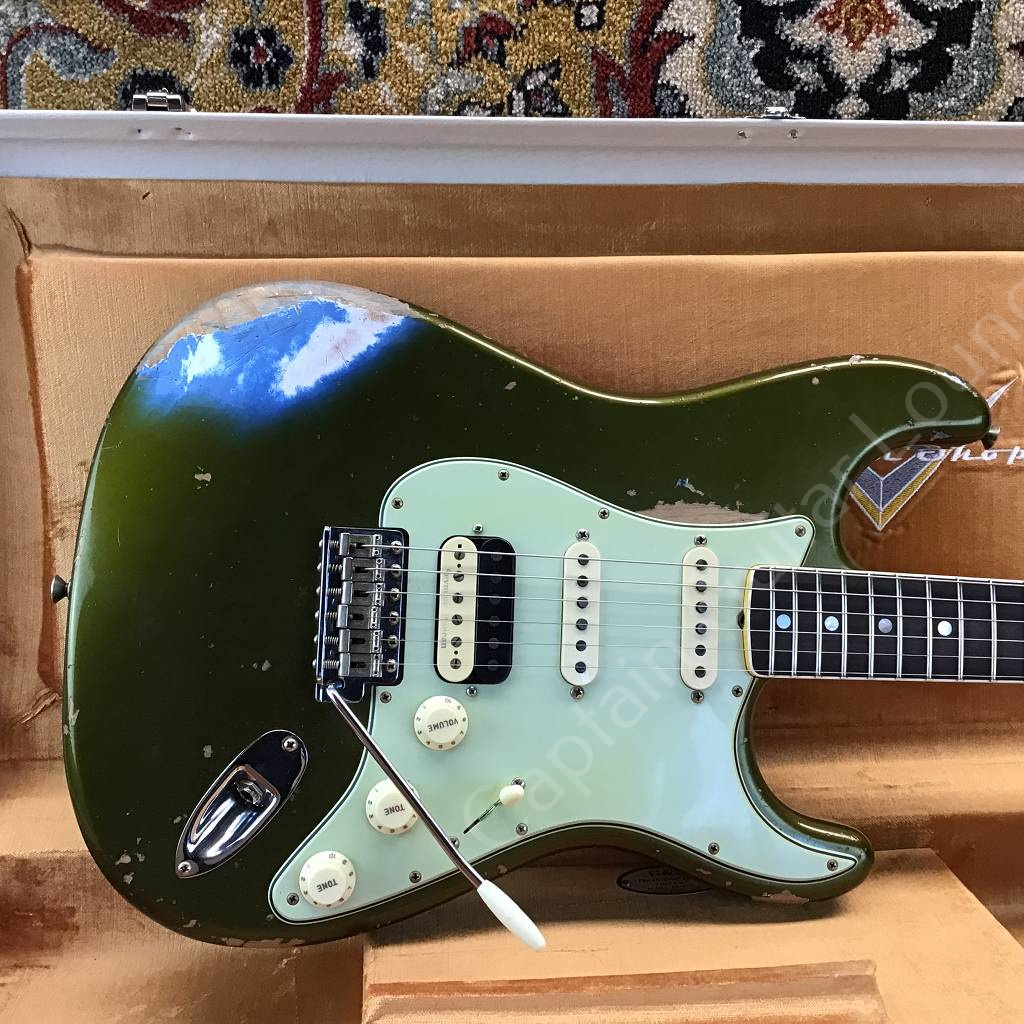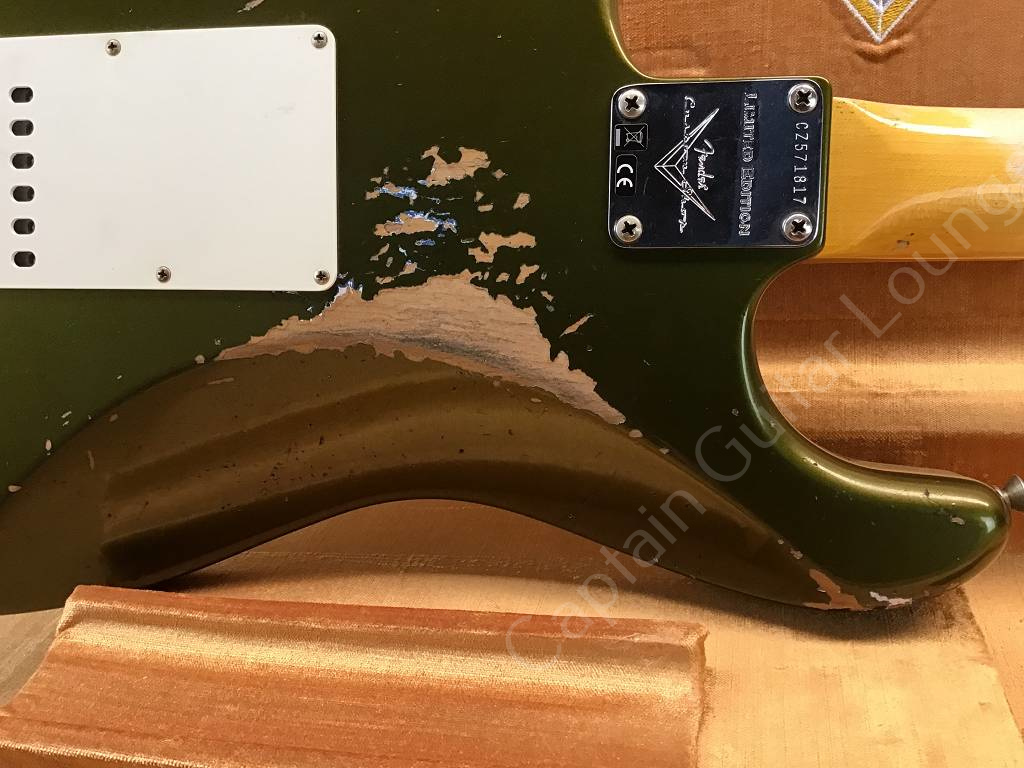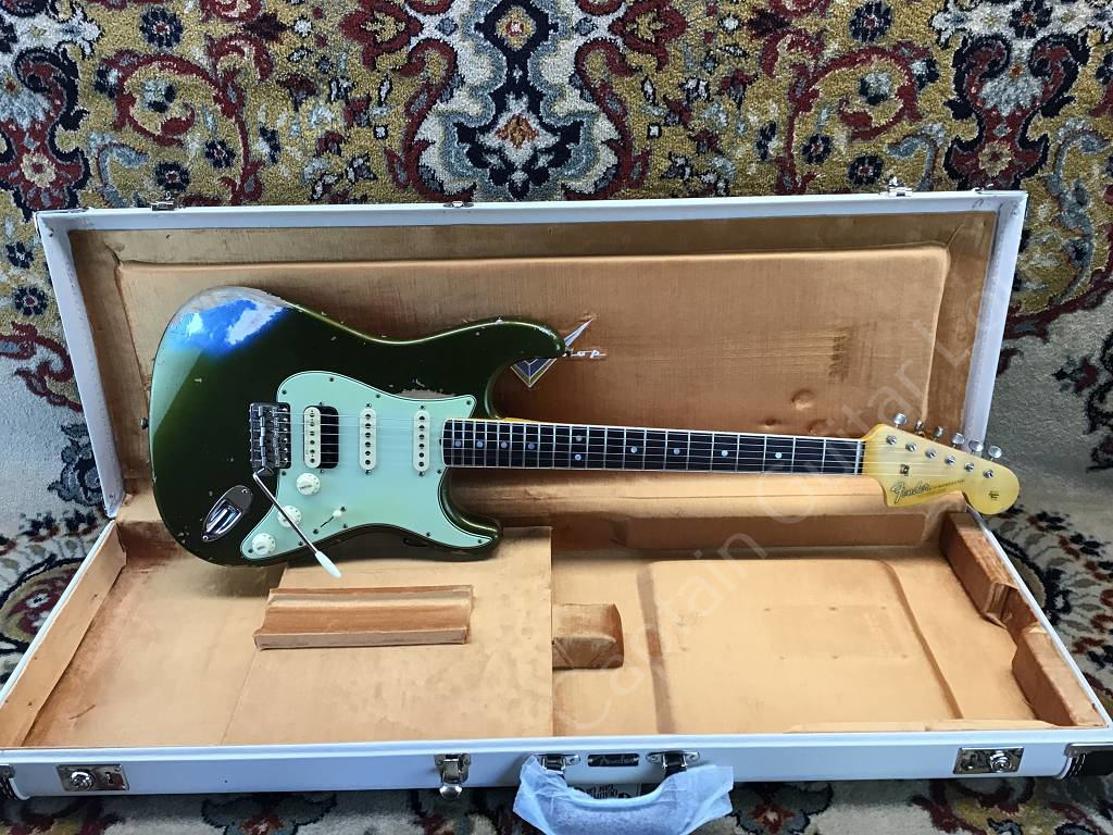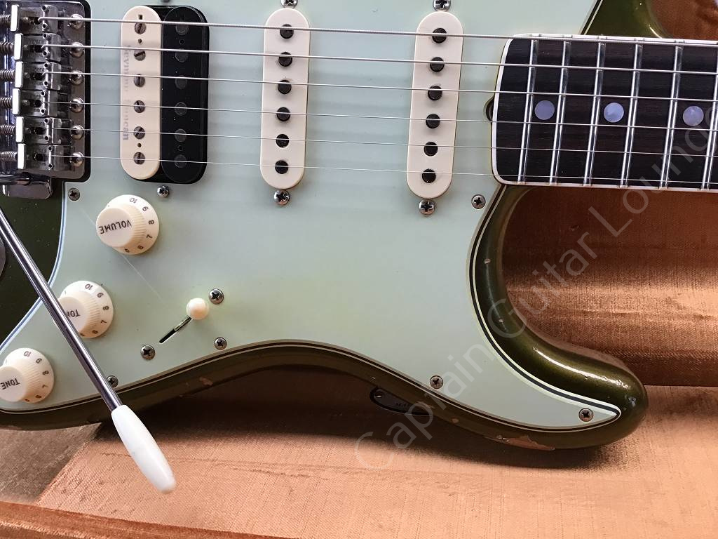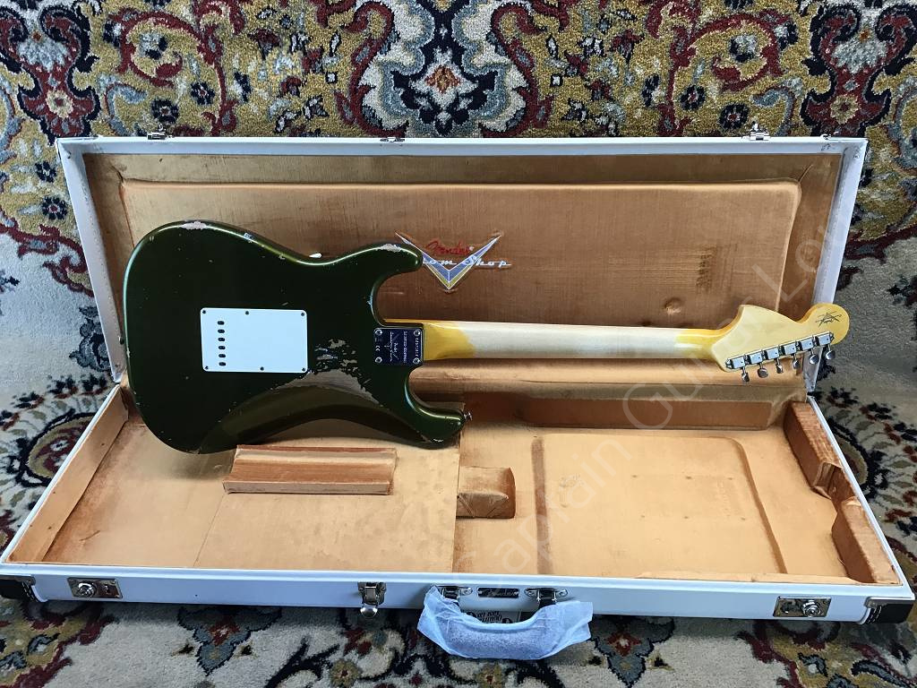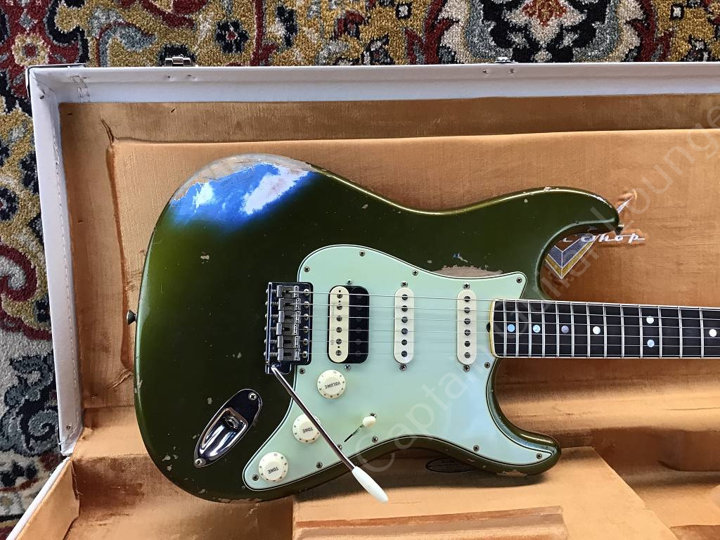 Mit dieser LTD 67 HSS Strat HRE in Irish Pub Green hat der Fender Customshop eine echte Rockmaschine geschaffen. Diese Gitarre ist ein Einzelstück aus einer Bestellung im Rahmen der 2022 Fall Event Limited Edition. Der Ahornhals mit großer Kopfplatte und Transition Decal hat ein Palisander Griffbrett, welches mit einem weißen Binding versehen ist. Als Tonabnehmer dienen handwound fat 64 Strat-PUs in der Hals- und Mittel-Position sowie ein Seymour Duncan 78 EVH Zebra Humbucker in der Steg-Position, dadurch ist sie klanglich sehr vielseitig. Von typischen Strat-Sounds bis ordentlich rockig ist alles drin. Die seltene Farbe Irish Pub Green hat ein geschmackvolles und nicht übertriebenes Heavy Relic erhalten. Das Custom Shop Decal auf der Kopfplatten-Rückseite und die Halsplatte haben zusätzlich einen Limited Edition Schriftzug.