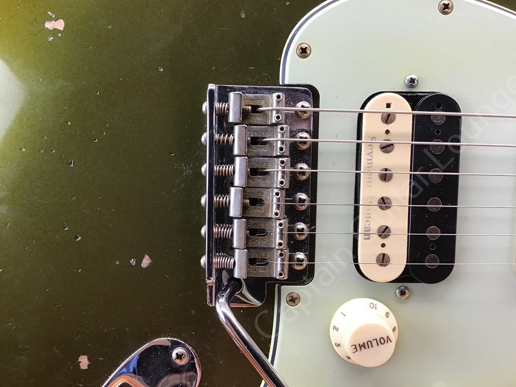 - Brücke: 6-Punkt Tremolo mit 6 gebogenen Saitenreitern aus Stahl