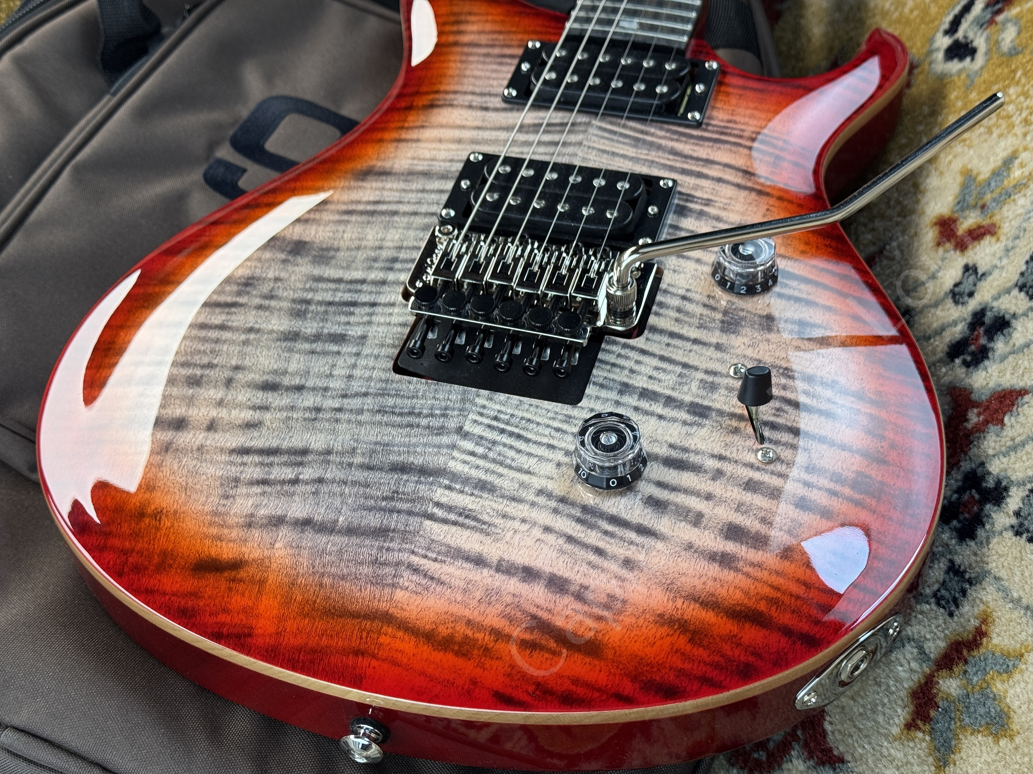 Dieses 2024er Modell kommt im edlen Charcoal Cherry Burst Finish und ist mit einem Floyd Rose Tremolo ausgestattet, ideal für Divebombs, präzises Vibrato und stabile Stimmung.