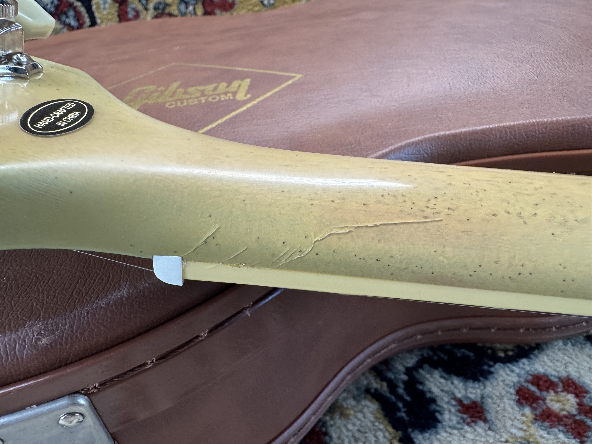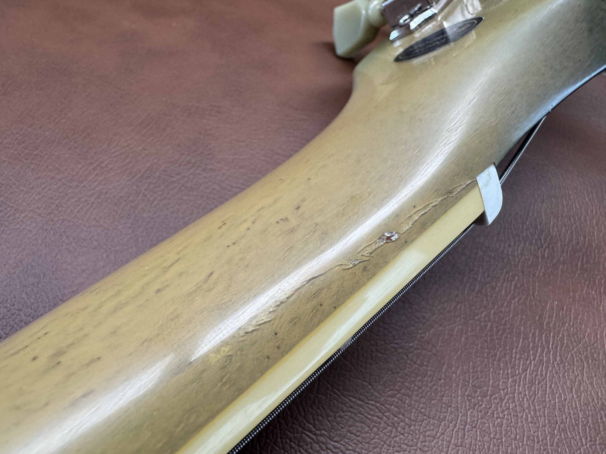 Der Hals/Kopfplattenübergang hatte einen leichten Riss, der fachgerecht repariert wurde. Technisch stabil und problemlos spielbar.