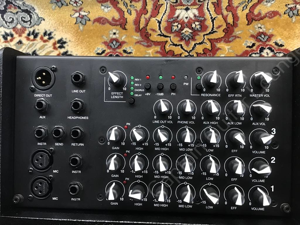 - Eingänge: 2x XLR/6,3 mm Klinke (Ch 1+2), 2x 6,3 mm Klinke (Ch 3+AUX-In),