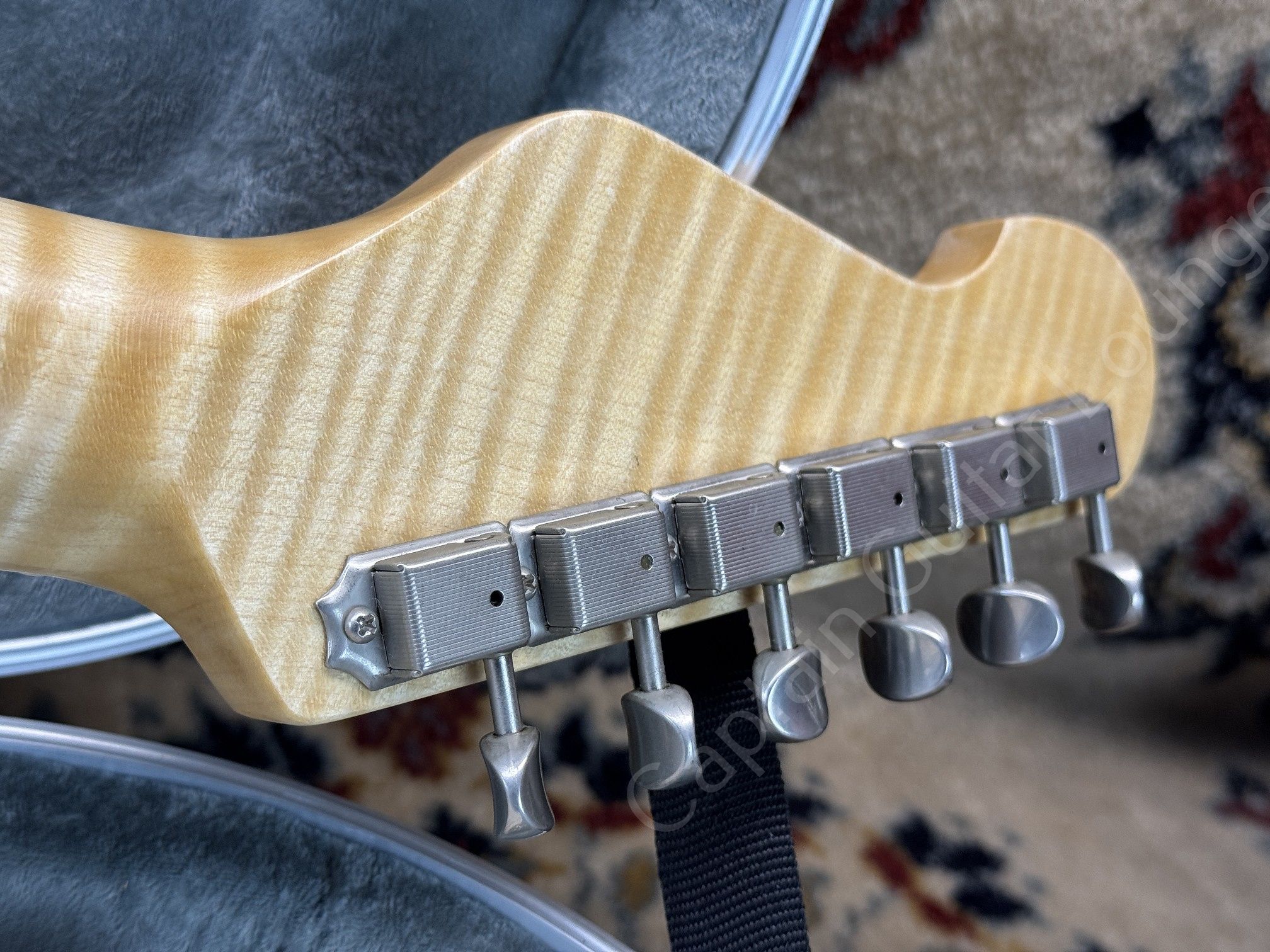 Der geflammte Ahornhals mit 10" Radius und Jescar Medium Jumbo Bünden spielt sich butterweich.